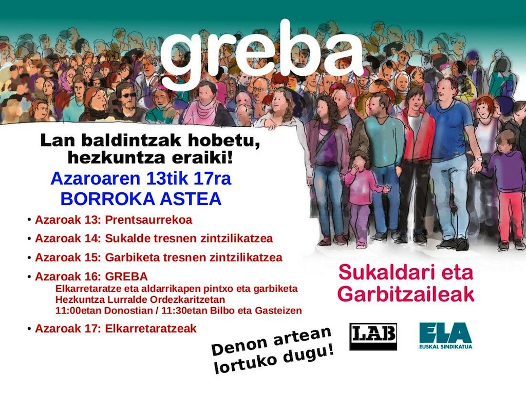 -El jueves, haremos huelga en el sector, y realizaremos concentraciones, cadenas humanas y un lunch reivindicativo ante la delegación del Gobierno vasco en cada capital.