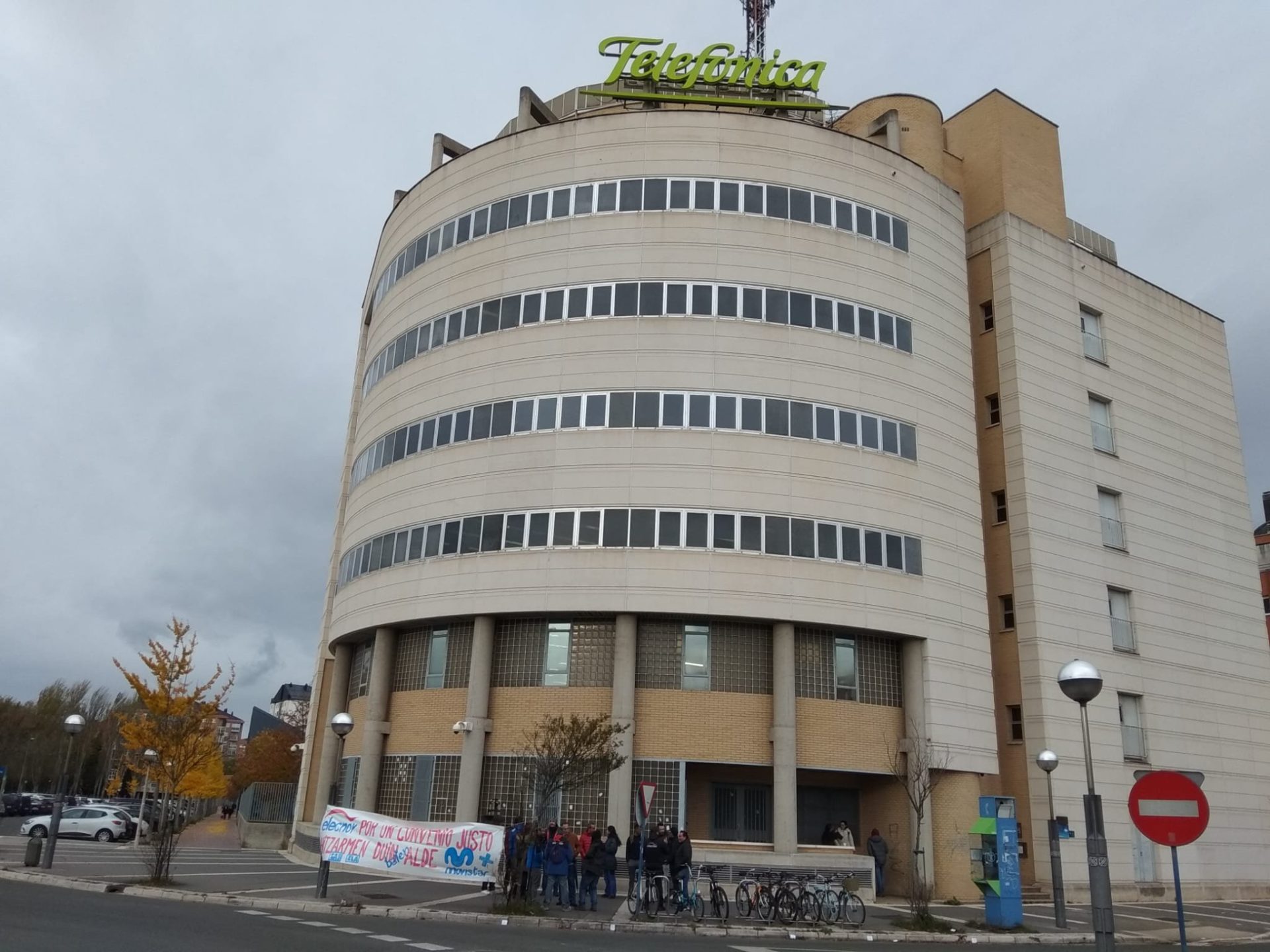 La quinta jornada de huelga convocada en Elecnor Telecomunicaciones ha vuelto a resultar un éxito. Los trabajadores de la subcontrata de Telefónica han realizado sendas concentraciones para denunciar su situación laboral, la primera frene al Edificio de Telefónica en Lakua de 09:00 a 10:00, y la segunda al mediodía en frente de la tienda de Telefónica de la plaza General Loma.