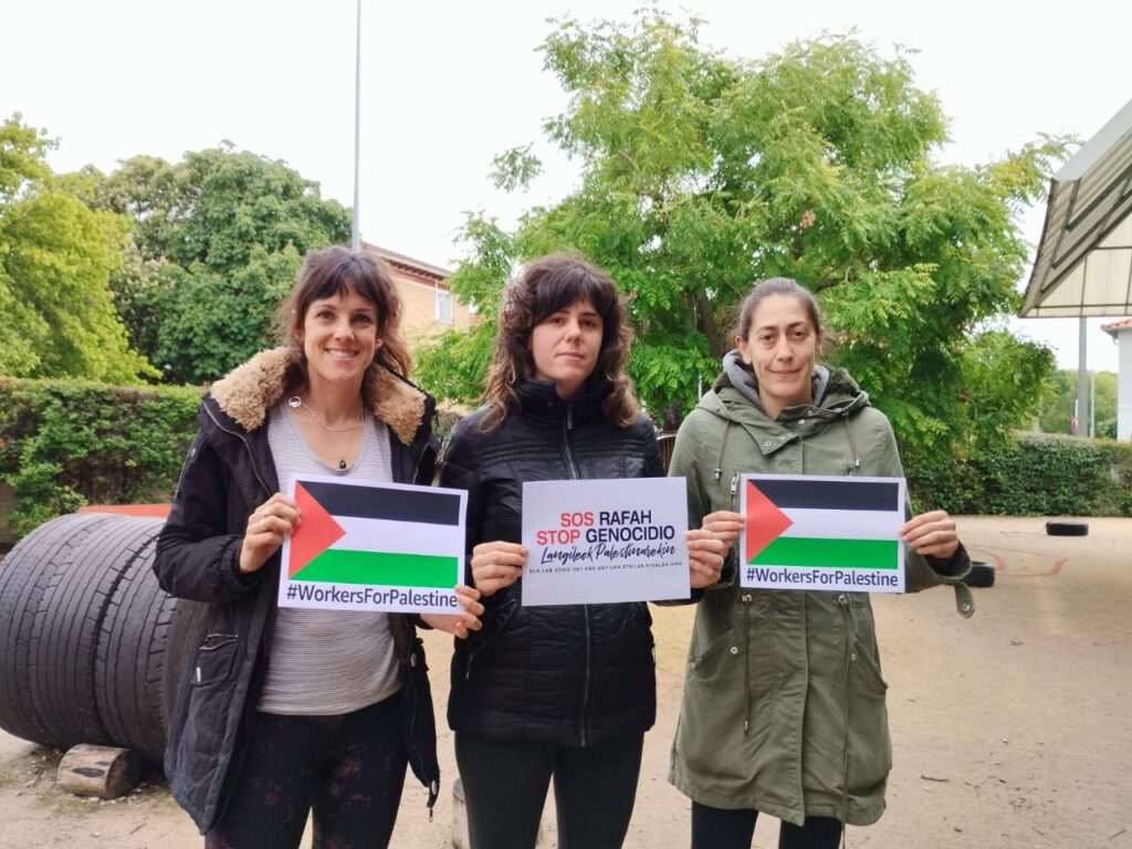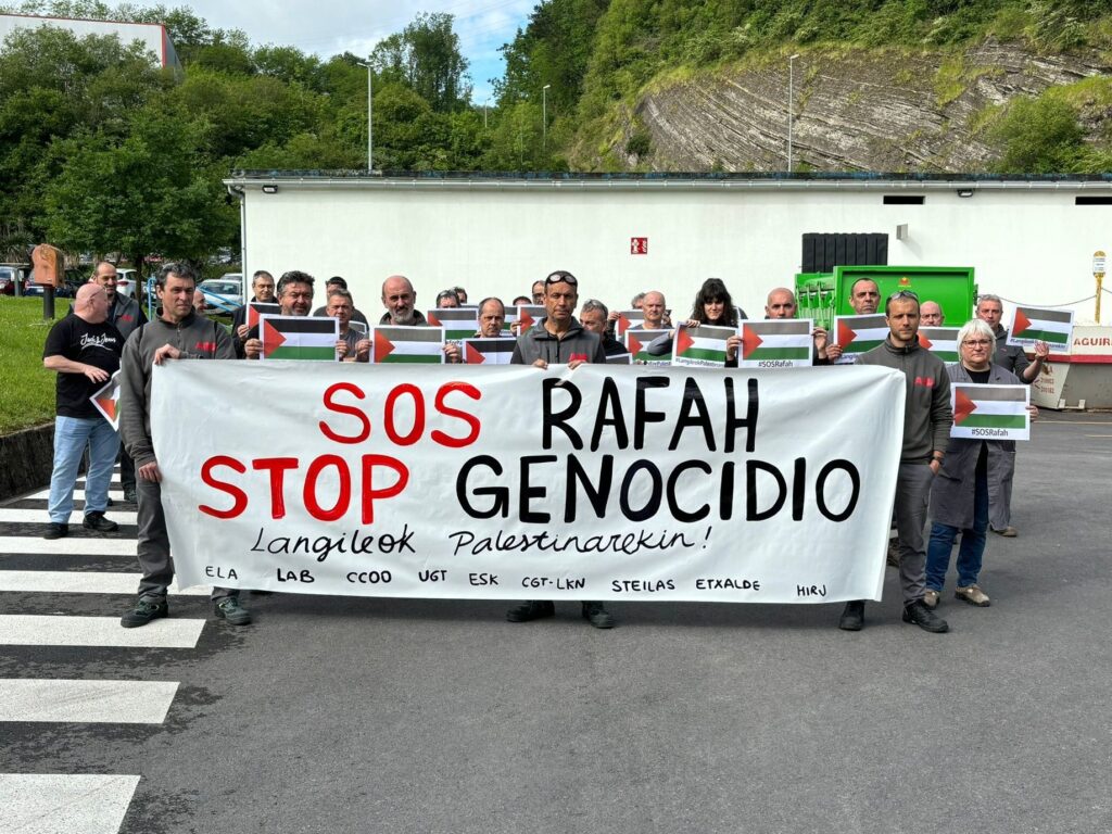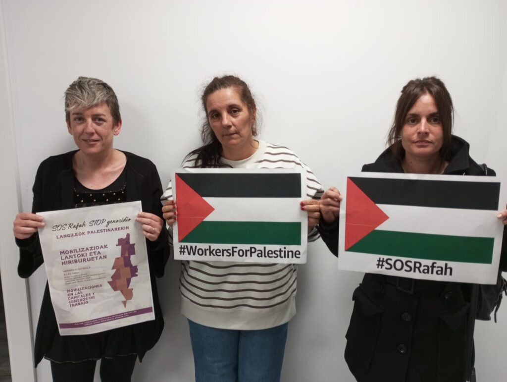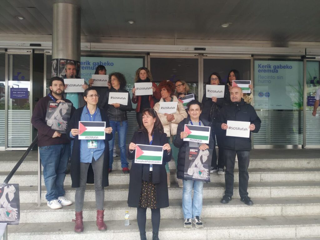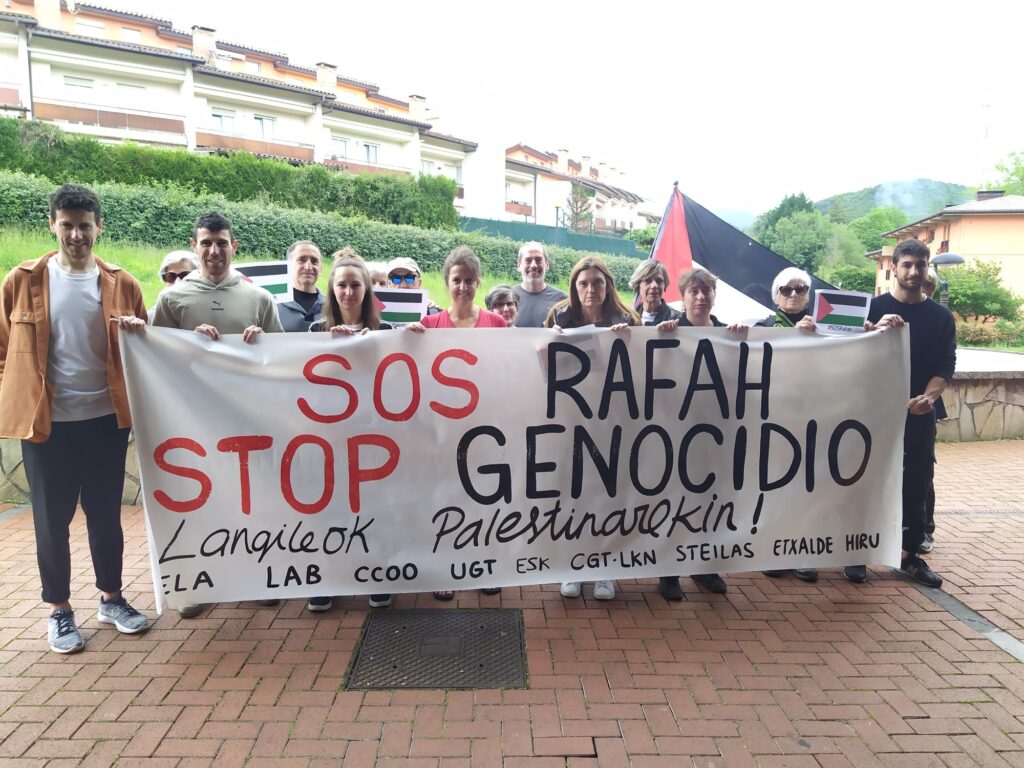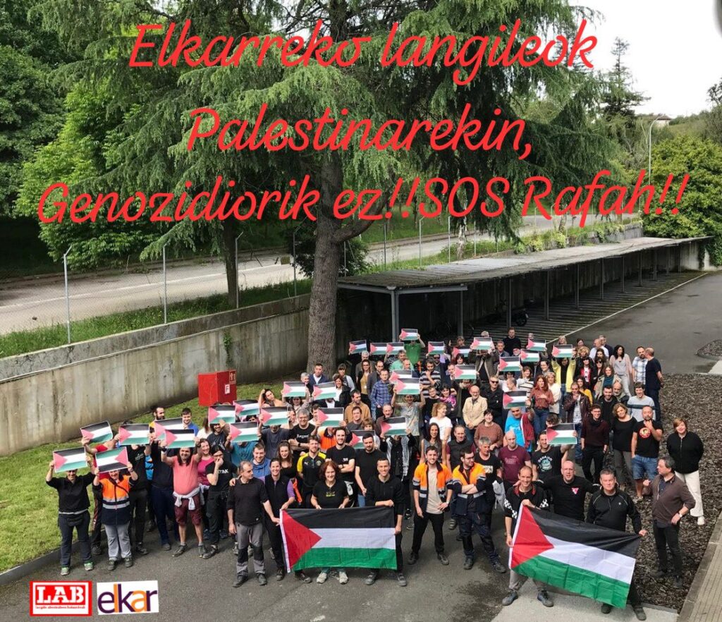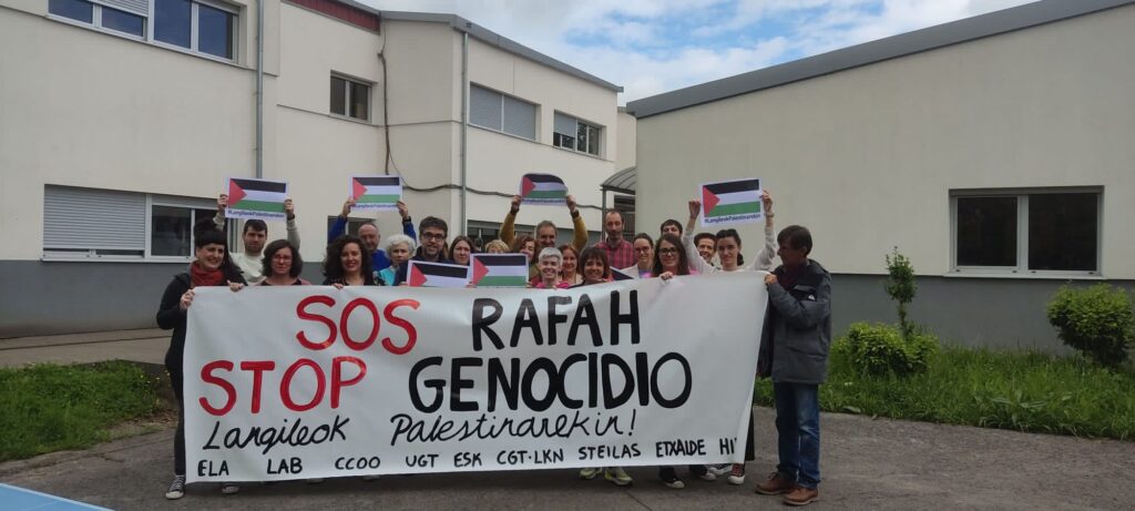 En el marco de las iniciativas convocadas para hoy bajo el lema S.O.S. Rafah, STOP genocidio, en numerosos centros de trabajo de Euskal Herria hemos mostrado nuestra solidaridad con la ciudadanía palestina y hemos exigido la inmediata paralización del cruel genocidio que Israel está llevando a cabo.