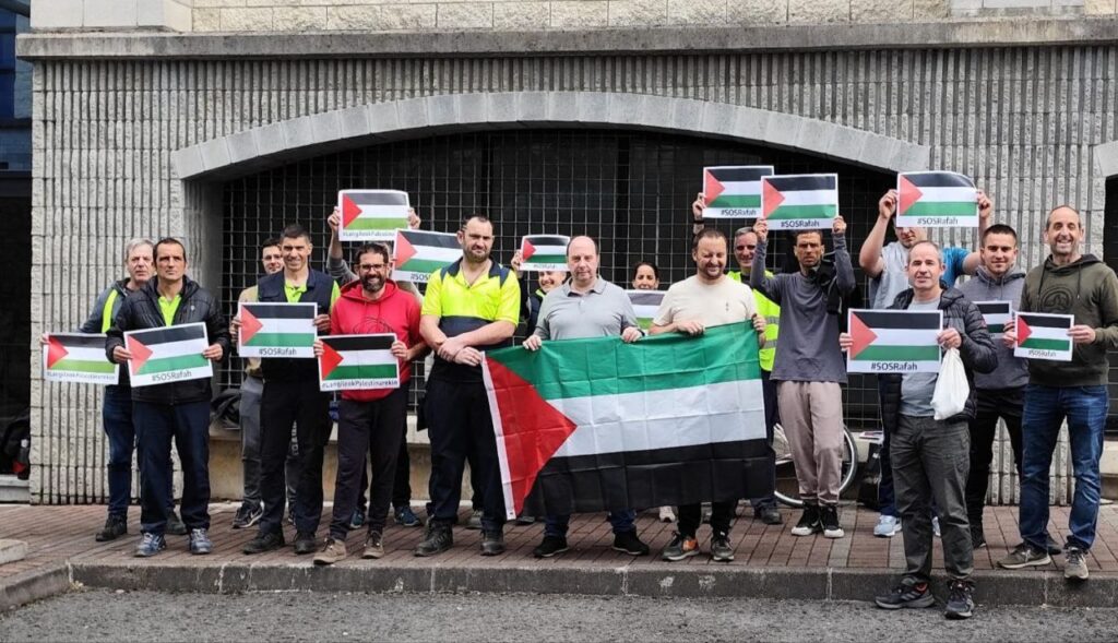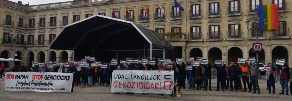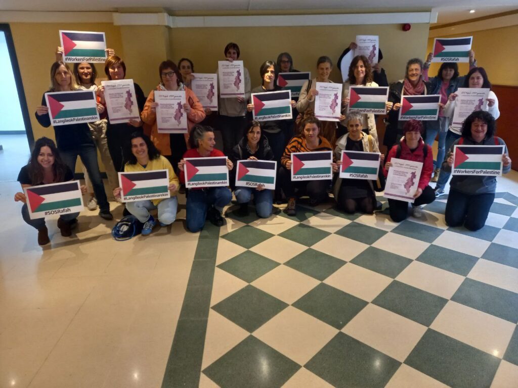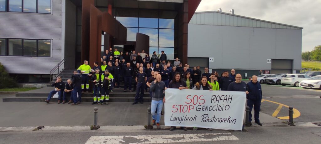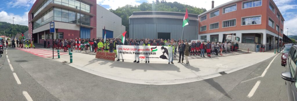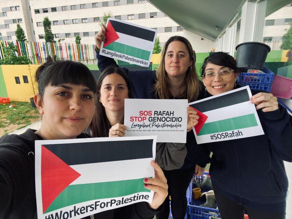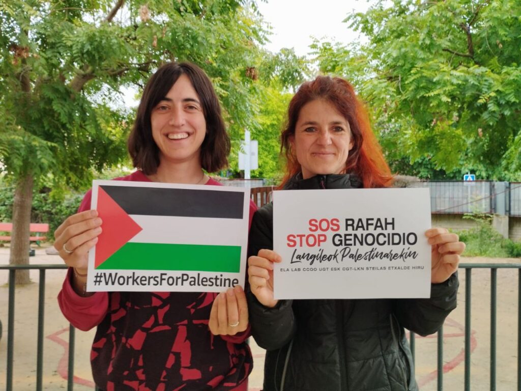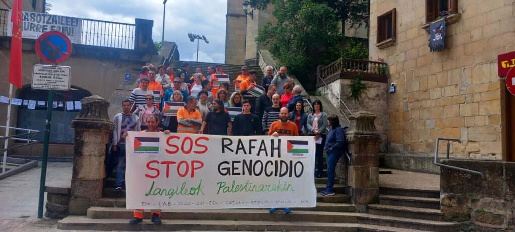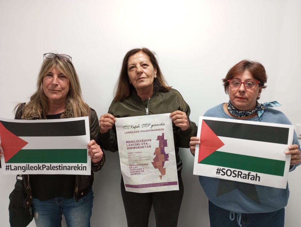 En el marco de las iniciativas convocadas para hoy bajo el lema S.O.S. Rafah, STOP genocidio, en numerosos centros de trabajo de Euskal Herria hemos mostrado nuestra solidaridad con la ciudadanía palestina y hemos exigido la inmediata paralización del cruel genocidio que Israel está llevando a cabo.