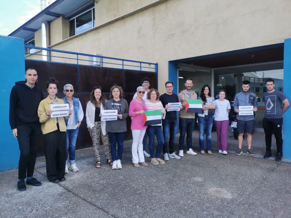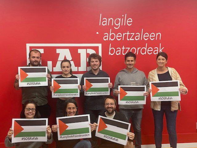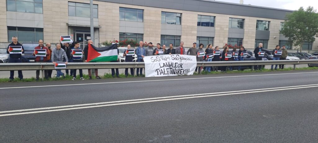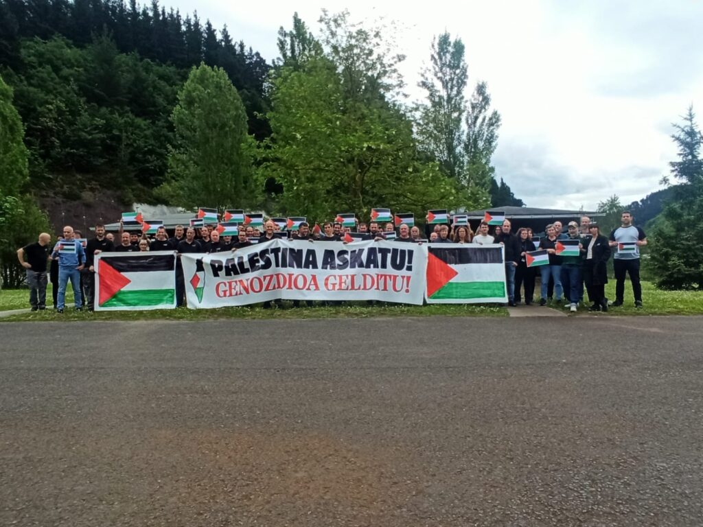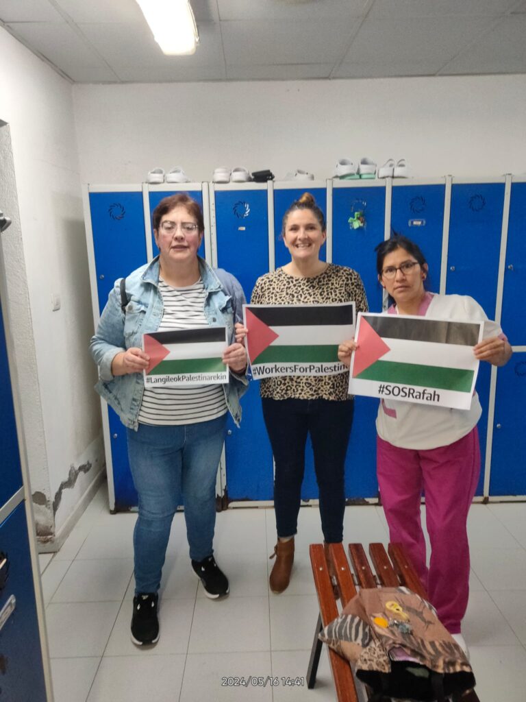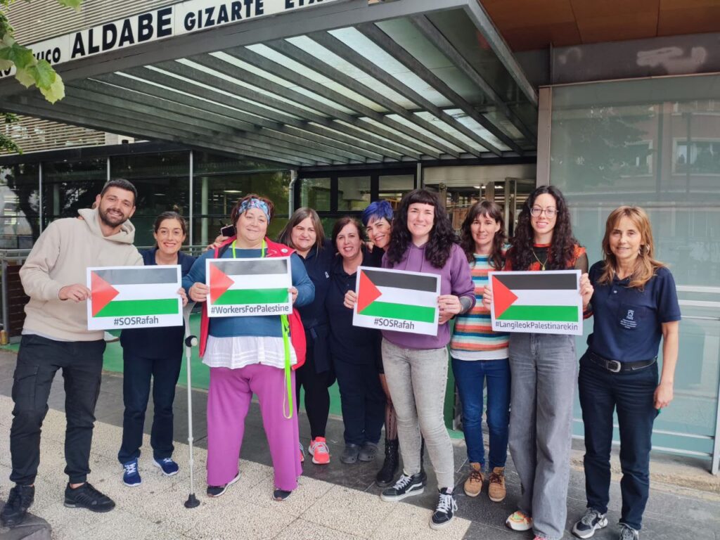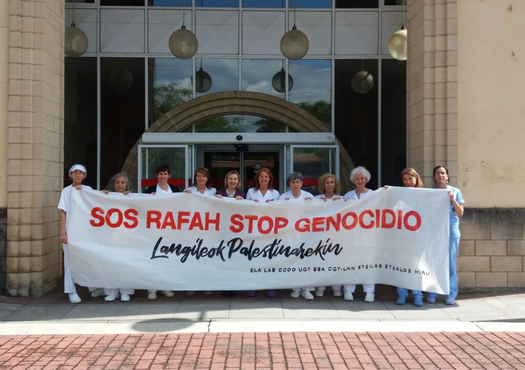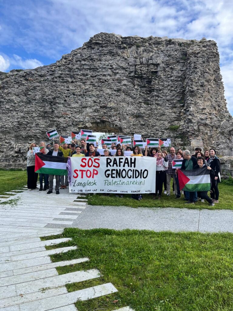 En el marco de las iniciativas convocadas para hoy bajo el lema S.O.S. Rafah, STOP genocidio, en numerosos centros de trabajo de Euskal Herria hemos mostrado nuestra solidaridad con la ciudadanía palestina y hemos exigido la inmediata paralización del cruel genocidio que Israel está llevando a cabo.