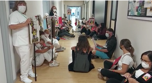 Seguimos interpelando a las empresas adjudicatarias, a Osakidetza y a la Consejera de Sanidad del Gobierno Vasco en el marco de la lucha de las limpiadoras de Osakidetza. Hoy hemos trasladado la acción al Hospital Donostia junto con las compañeras de la intersindical y hemos hecho ver nuestras reivindicaciones una vez más a través de la sentada.