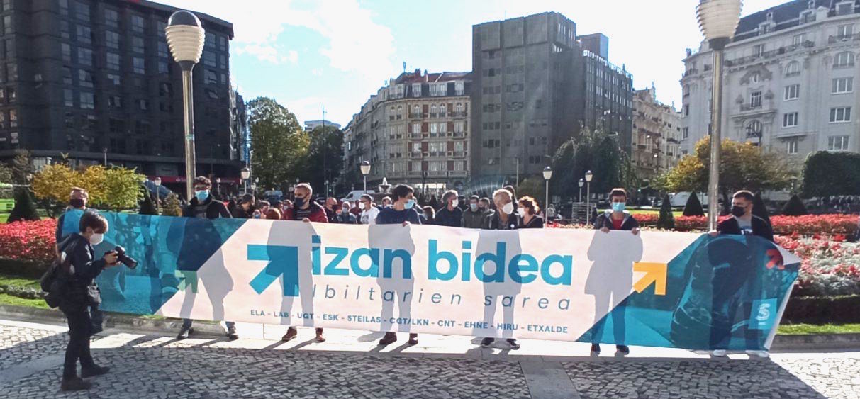 Los sindicatos LAB, ELA, UGT, ESK, STEILAS, CGT/LKN, CNT, EHNE, HIRU y Etxalde nos hemos concentrado en la Plaza Elíptica de Bilbo en defensa de los derechos de las y los presos vascos, dentro de la iniciativa «Izan Bidea» de Sare.