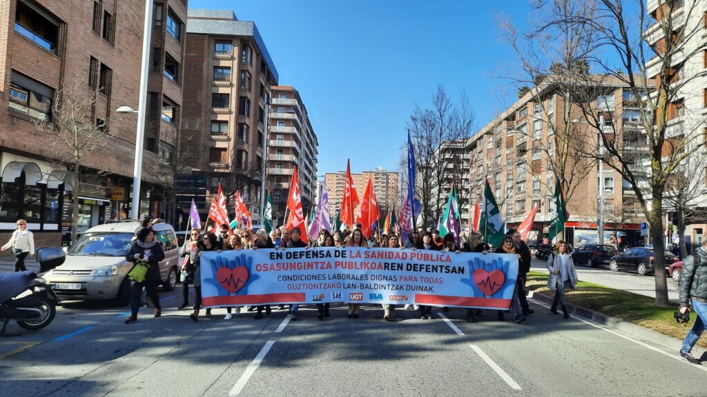 En la manifestación de hoy también ha participado la coordinadora general de LAB, Garbiñe Aranburu, que se ha unido a la columna de trabajadores y trabajadoras de Osasunbidea. Precisamente, el personal sanitario ha querido destacar la inestabilidad que se está produciendo en Osasunbidea y la falta de iniciativas del Departamento de Salud.