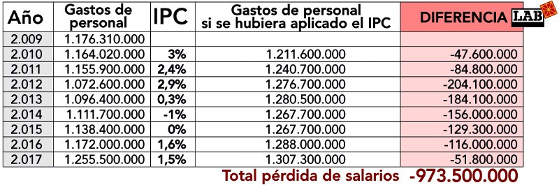 Pero donde se visualiza la verdadera dimensión de la sustracción de rentas de nuestros salarios, que luego se han utilizado para pagar las deudas bancarias y otras necesidades del capital, es cuantificando todo el monto económico dejado de utilizar para el capítulo de personal desde el inicio de los recortes y congelaciones salariales. Utilizando los datos oficiales de las cuentas de Navarra vamos a descubrir cuánto dinero ha volado de nuestros bolsillos.