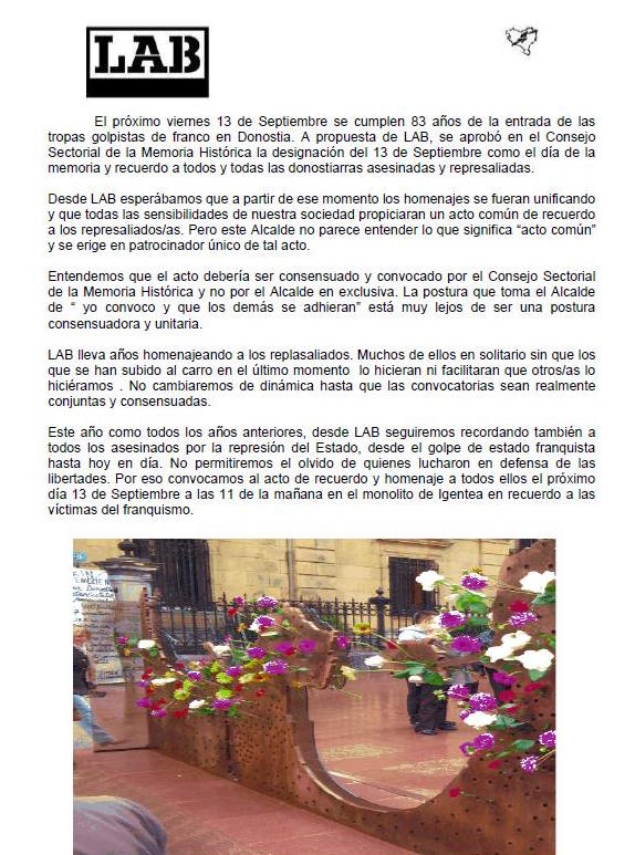 El 13 de septiembre se cumplen 83 años de la entrada de las tropas golpistas de Franco en Donostia. A propuesta de LAB, se aprobó en el Consejo Sectorial de la Memoria Histórica la designación del 13 de septiembre como día de la memoria y recuerdo a todas y todos los donostiarras asesinados y represaliados. Mañana, a las 11:00, realizaremos un acto ante el monolito de la calle Igentea, frente al ayuntamiento.