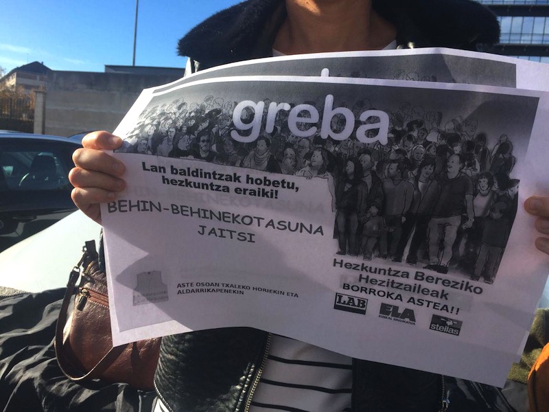 Dando continuidad a las movilizaciones y huelgas realizadas el pasado curso, la huelga convocada para hoy entre el personal de Educación Especial de la enseñanza pública ha tenido un amplísimo seguimiento. Más del 75% de una plantilla de cerca de 1.000 trabajadoras y trabajadores ha secundado la huelga y cientos de personas (Especialistas de Apoyo Educativo, Fisioterapeutas, Intérpretes de Lengua de Signos, Terapeutas Ocupacionales, Trabajadoras Sociales y Transcriptoras) han salido a la calle para denunciar la grave situación que sufrimos en Educación Especial, socializar nuestras reivindicaciones y exigir al Departamento de Educación del Gobierno Vasco, una negociación que dé respuesta a esta situación.