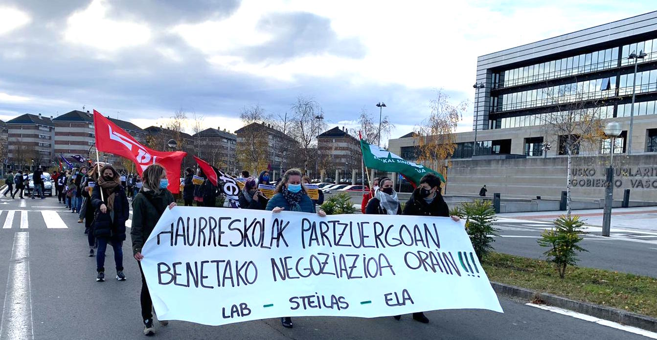 Al igual que el pasado 10 de diciembre, las y los trabajadores del Consorcio Haurreskolak se han sumado a la huelga convocada por los sindicatos LAB, STEILAS y ELA, que ha tenido un seguimiento del 75%, algo mayor que en la convocatoria anterior. En la jornada de hoy cientos de trabajadoras han salido a las concentraciones y manifestaciones que hemos convocado en Gasteiz, Bilbao y Eibar, mientras que, la junta directiva del Consorcio Haurreskolak se reunía en Lakua. Nos han convocado a una mesa negociadora el próximo día 22, que en principio contará con la asistencia de representantes del departamento de Educación del Gobierno Vasco. Paradójicamente, en el orden del día sólo han incorporado el preacuerdo del personal de gestión. Este preacuerdo se firmó hace casi un año y todavía no se ha cumplido.
