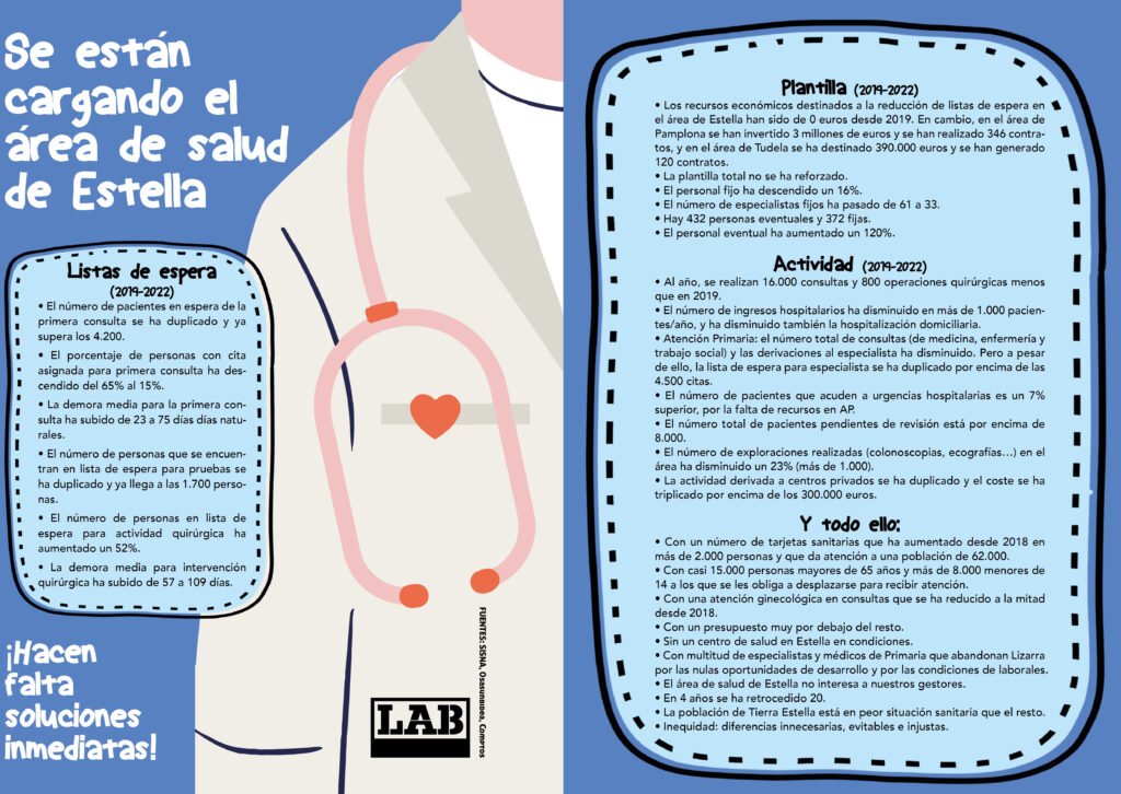 Desde 2019 el Gobierno de Nafarroa ha destinado 0 euros para intentar reducir las listas de espera en el Área de Salud de Estella. Desde entonces y hasta 2022, la demora media de la espera para la primera consulta subió de 23 a 75 días. Esos son simplemente dos datos oficiales, de entre muchos, que demuestran el abandono y desmantelamiento de la atención sanitaria pública en Tierra Estella y que desde el sindicato LAB estamos dando a conocer en la zona mediante una campaña de denuncia.