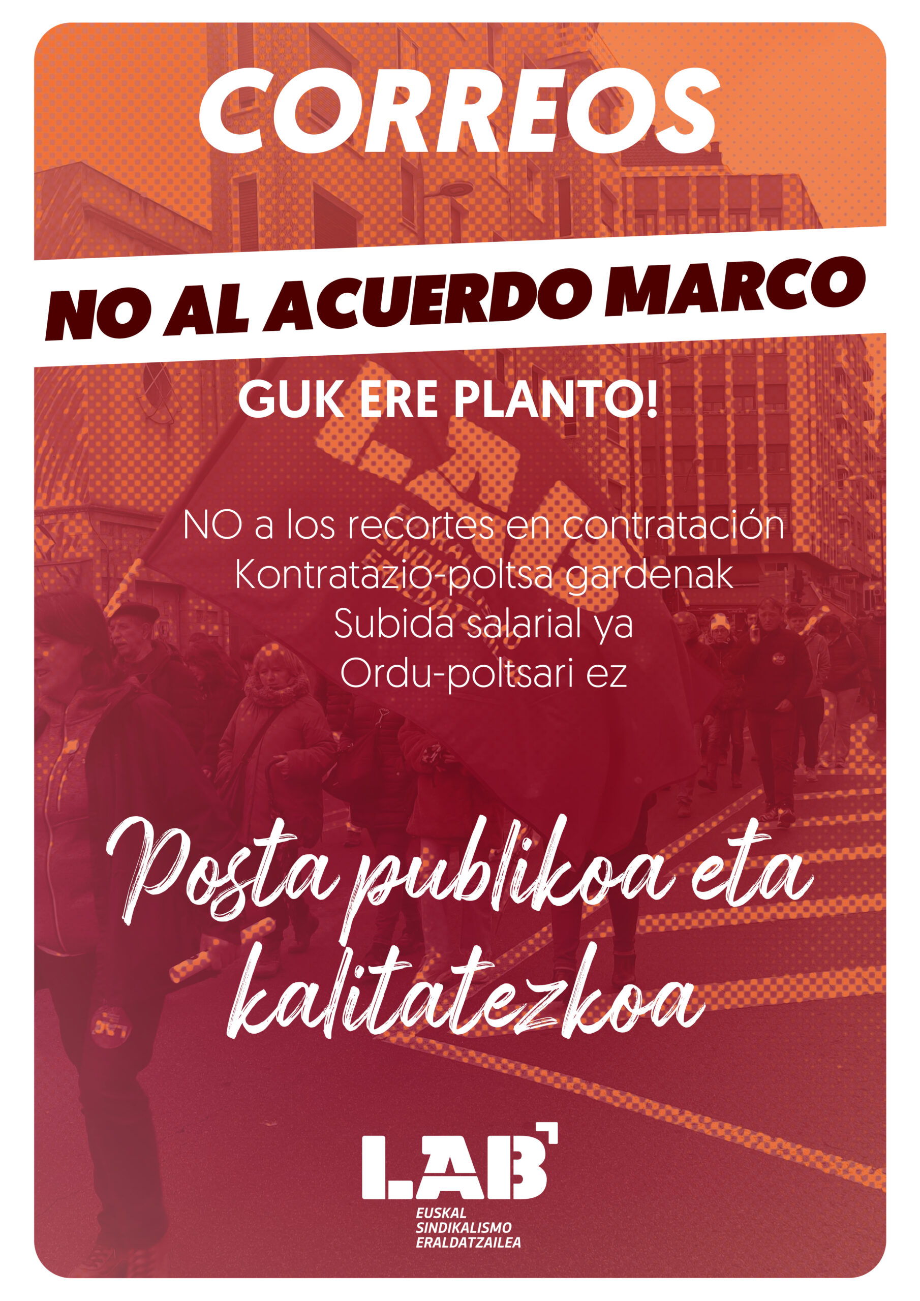 El Sindicato LAB se opone al Acuerdo Marco de Correos “Acuerdo Correos y Sindicatos de las líneas básicas a trasladar al IV Convenio Colectivo y Acuerdo General”, firmado por CCOO, UGT y CSIF. Este acuerdo contiene diferentes aspectos muy negativos para la plantilla. Tanto en materia salarial como en conciliación familiar, contratación, etc, representando un serio retroceso en derechos