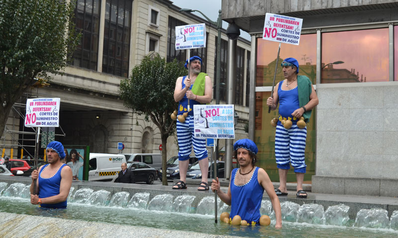 Hoy 22 de marzo, Día Mundial del Agua, miembros de la plataforma Ur Publikoaren Defentsan nos hemos zambullido en la fuente de la Plaza Circular de Bilbao para denunciar los cortes de suministro de agua a las familias empobrecidas, la opacidad del Consorcio de Aguas Bilbao Bizkaia (CABB) y para exigir que el agua sea considerada y gestionada como un bien social que satisfaga las necesidades de las personas y no como un negocio que genera pingües beneficios a las empresas gestoras.