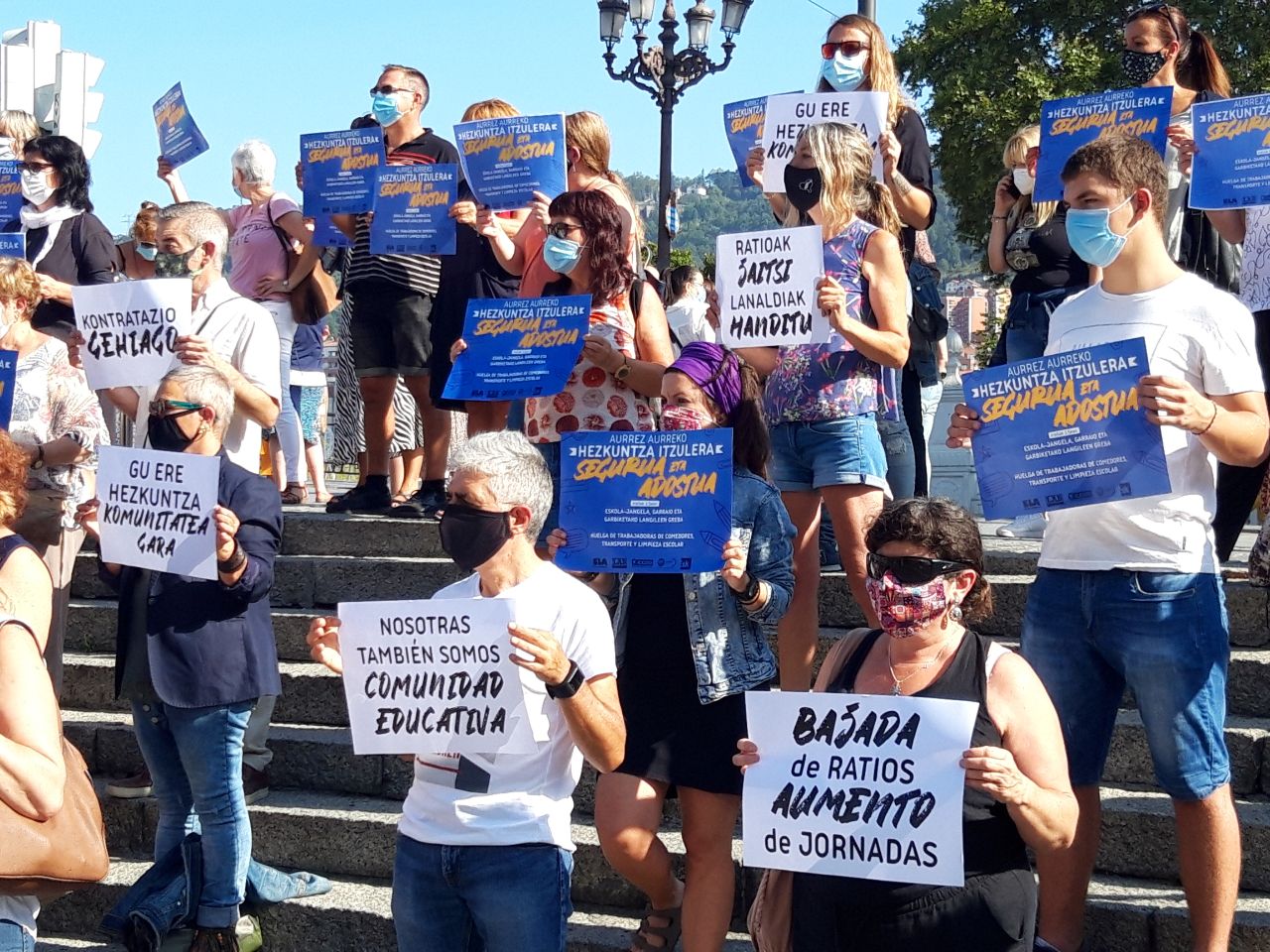 Trabajadoras de subcontratas de Educación, es decir, trabajadoras de limpieza, comedores y transporte escolar, se han movilizado en la plaza de Arriaga de Bilbo, a convocatoria de LAB, ELA, CCOO, UGT y ESK. Concretamente, han hecho un llamamiento a las trabajadoras del sector a secundar la huelga convocada para el 15 de septiembre en el ámbito educativo de la CAV por un regreso presencial en educación que sea seguro y saludable.