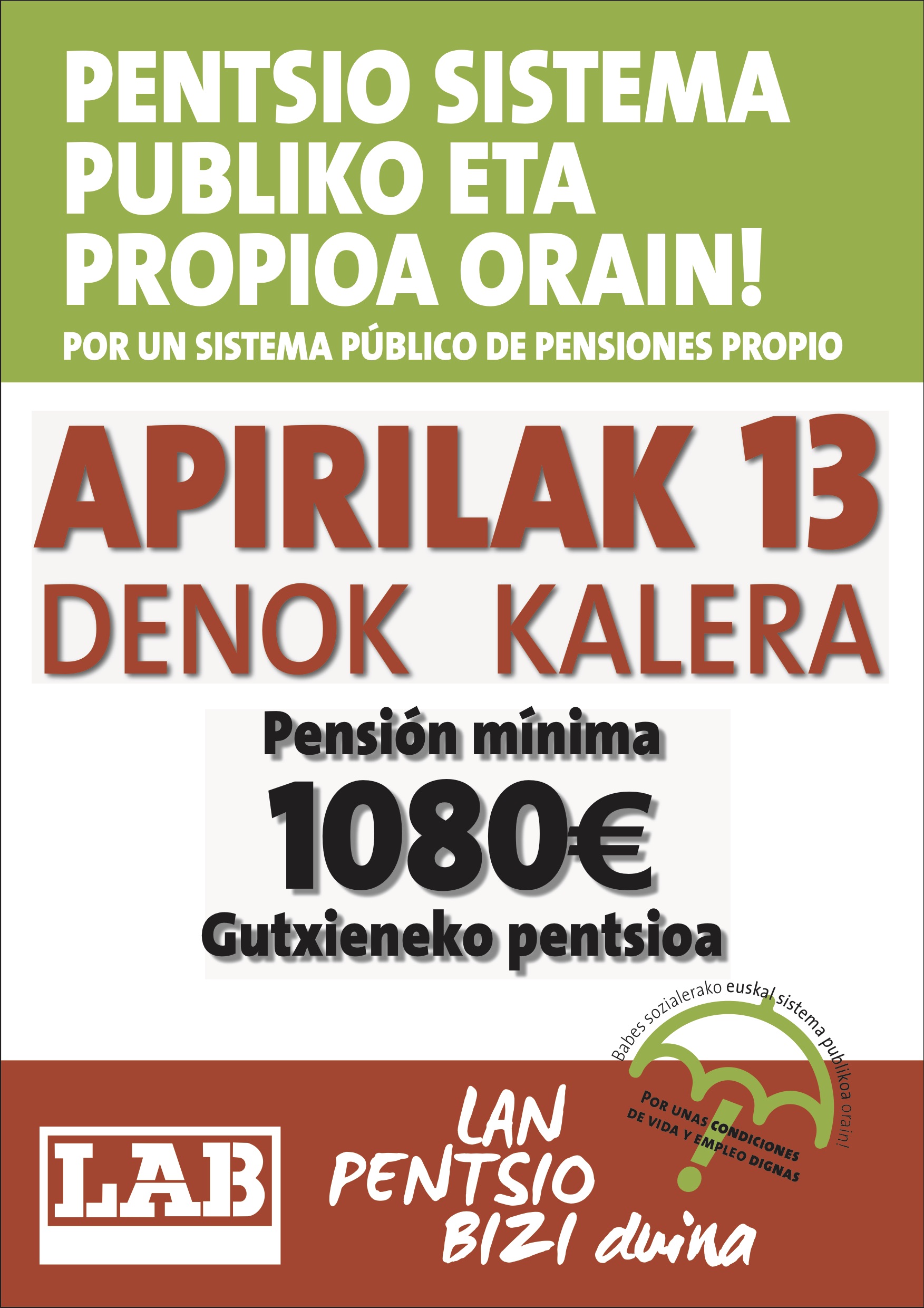 LAB estará presente en las movilizaciones convocadas por el conjunto del movimiento de pensionistas de Hego Euskal Herria en las cuatro capitales, este sábado 13 de abril y llama a sus bases a participar en ellas. En esta coyuntura política y social es más necesario que nunca poner el énfasis en la defensa de los derechos de las personas pensionistas. El movimiento de pensionistas de Hego Euskal Herria es una piedra angular en la defensa de los derechos adquiridos como consecuencia de años lucha; pero no solo eso, sino que muestra el camino por el que tenemos que transitar para situar el debate político en los parámetros del cambio social que necesita Euskal Herria.