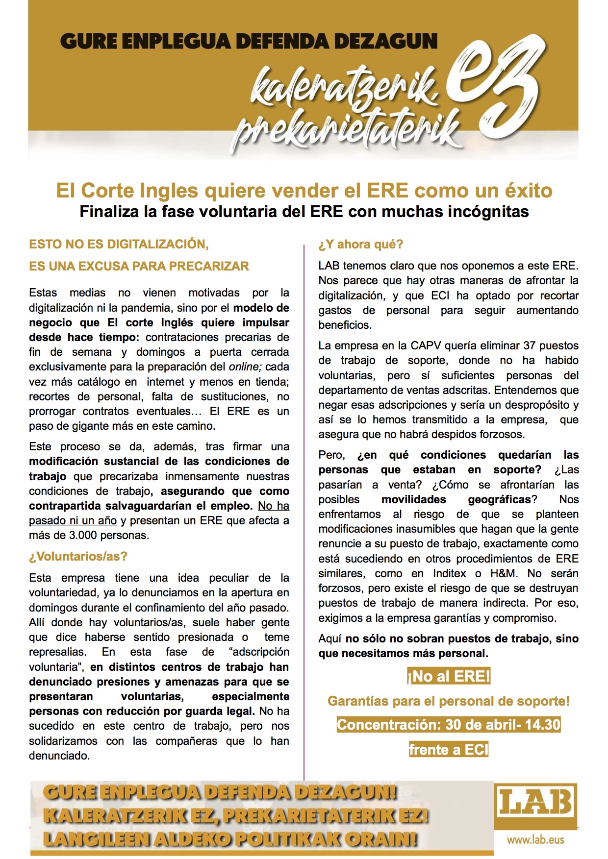 LAB muestra su oposición al ERE y considera que hay otras maneras de afrontar la digitalización, y que El Corte Inglés ha optado por recortar gastos de personal para seguir aumentando beneficios. Señala que en la CAV la empresa quería eliminar 37 puestos de trabajo soporte, donde no ha habido voluntarias, pero sí suficientes personas del departamento de ventas adscritas. LAB entiende que negar dichas adscripiciones sería un despropósito y así se lo ha transmitido a la empresa, que asegura que no habrá despidos forzosos.