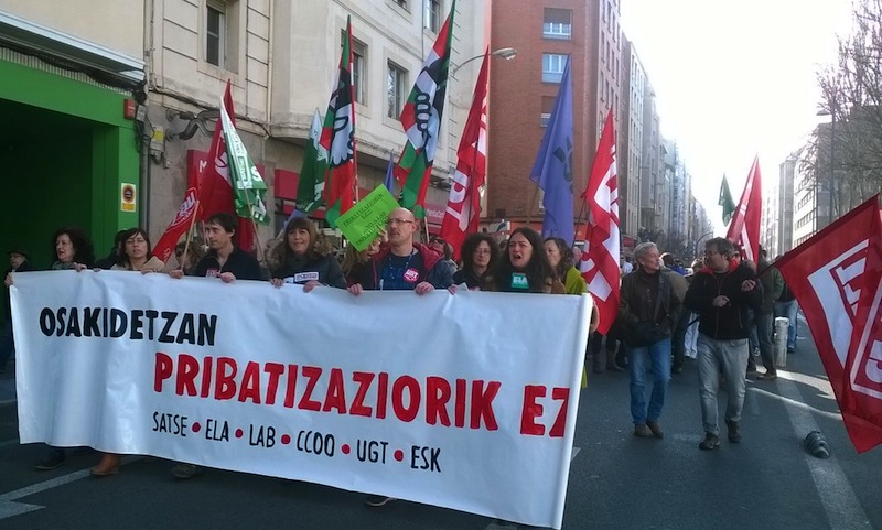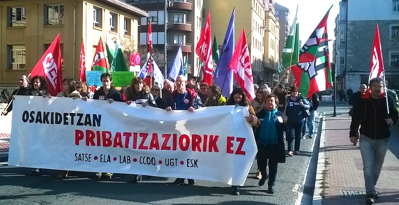 Los sindicatos nos hemos visto obligados a volver a movilizarnos ante nuevas privatizaciones. En concreto, Osakidetza ha planteado la privatización de los servicios de lencería y cocina del Hospital de Urduliz, del servicio de lavandería del Hospital de Leza, pretende externalizar el servicio informático y a la apertura del Hospital de Eibar quiere la gestión privada de diferentes servicios como la rehabilitación.