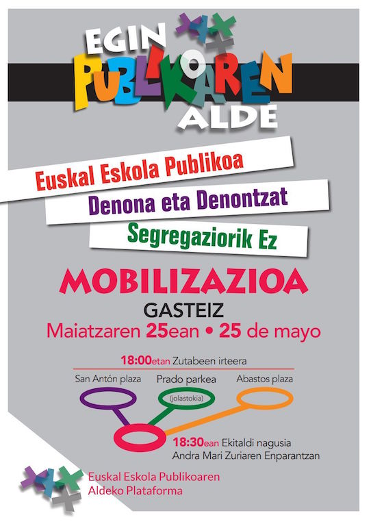 Por ello consideramos que es la hora de movilizarse como sociedad en favor de una escuela pública de todas y todos, y en contra de la segregación escolar, para lo cual convocamos a una movilización masiva el día viernes 25 de mayo en Vitoria-Gasteiz.