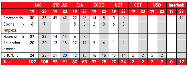 Los datos definitivos a 31 de marzo confirman la victoria de LAB en la UPV/EHU y en la Educación Pública no universitaria de la CAV, incluido el Consorcio Haurreskolak. Por lo tanto, a todas las personas que os habéis acercado a votar LAB: ¡Enhorabuena y gracias por apoyar la línea de trabajo de LAB! Somos la primera fuerza y hemos conseguido ser el sindcato con el mayor número de delegados y delegadas en la educación pública.