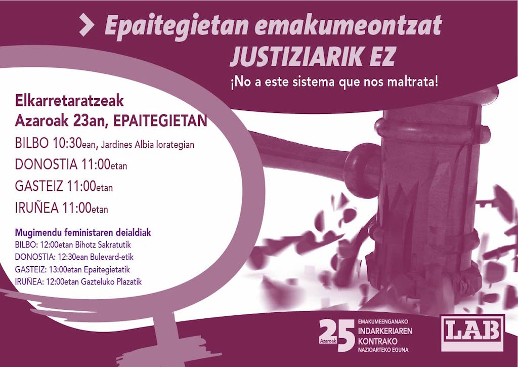 Nos movilizaremos el viernes, día 23 de noviembre, bajo el lema "Epaitegietan emakumeontzat Justiziarik ez ¡No a este sistema que nos maltrata!". Nos concentraremos frente a los juzgados el viernes para, posteriormente, el domingo, unirnos a las convocatorias del movimiento feminista. Frente a los juzgados nos movilizaremos a las 10:30 en Bilbo y a las 11:00, en Donostia, Gasteiz e Iruñea.