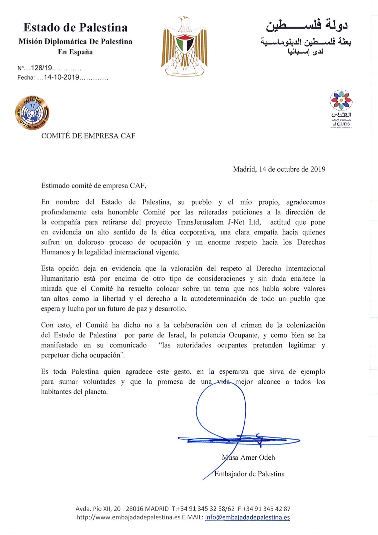 Palestinako Espianiako enbaxadak eskerrak eman dizkio CAFeko enpresa batzordeari, gutun baten bitartez, “okupazio mingarria” pairatzen dutenen alde jartzeagatik. Enpresa batzordeak egindako eskaera eredu izateko itxaropena azaltzen du Musa Amer Odeh enbaxadoreak gutunean, eta askatasuna eta herrien autodeterminazio eskubidearen aldeko aldarria egiten du. CAFeko enpresa batzordeak Jerusalemgo tranbia-linea berria eraikitzeko lizitazio-prozesuan ez parte hartzeko eskatu zion zuzendaritzari, eta, behin lehiaketa irabazita, lanak ez egiteko.
