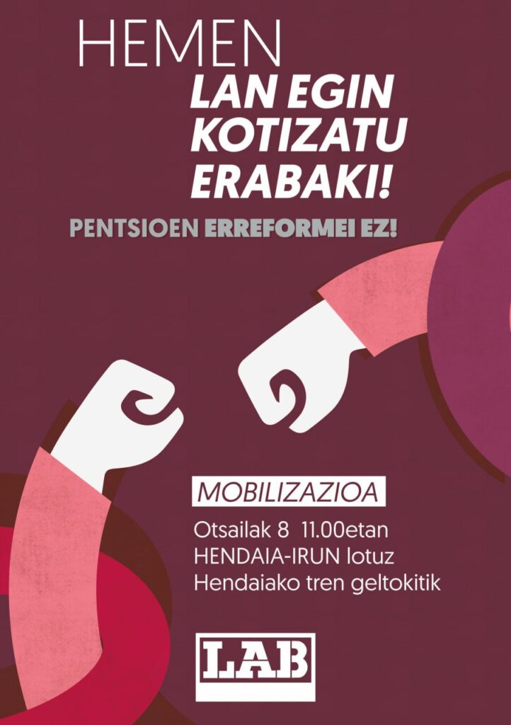 “Los argumentos utilizados en ambos estados para justificar la reforma de las pensiones son similares. Nos hablan del reto demográfico y se nos dice que los sistemas actuales de pensiones no son sostenibles”, ha explicado Aranburu, y ha destacado que dichas medidas “recortan derechos y endurecen las condiciones para cobrar la jubilación”. Todo ello responde, según LAB, “a la lógica de las políticas económicas neoliberales que benefician al negocio privado”.