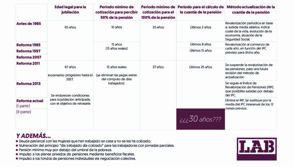 La representante de LAB ha señalado que el sindicato va a poner todo su empeño en parar esta reforma de pensiones: “Vamos a enviar cartas a Unidas Podemos, PNV y EH Bildu, para exigirles que no avalen los recrotes al sistema público de pensiones, así como para que defiendan la necesidad de un sistema propio de pensiones”.