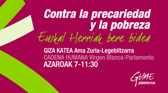 Gune Plataformak deituta, datorren ostiralean, hilak 7, giza katea egingo da Ama Zuritik Legebiltzarrera probreziara eta prekarietatera kondenatzen gaituzten politkak salatzera eta Hego Euskal Herriko erakundeei aldaketarako behar diren aurrekontu eta zerga-politikak aplika ditzaten eskatzera.