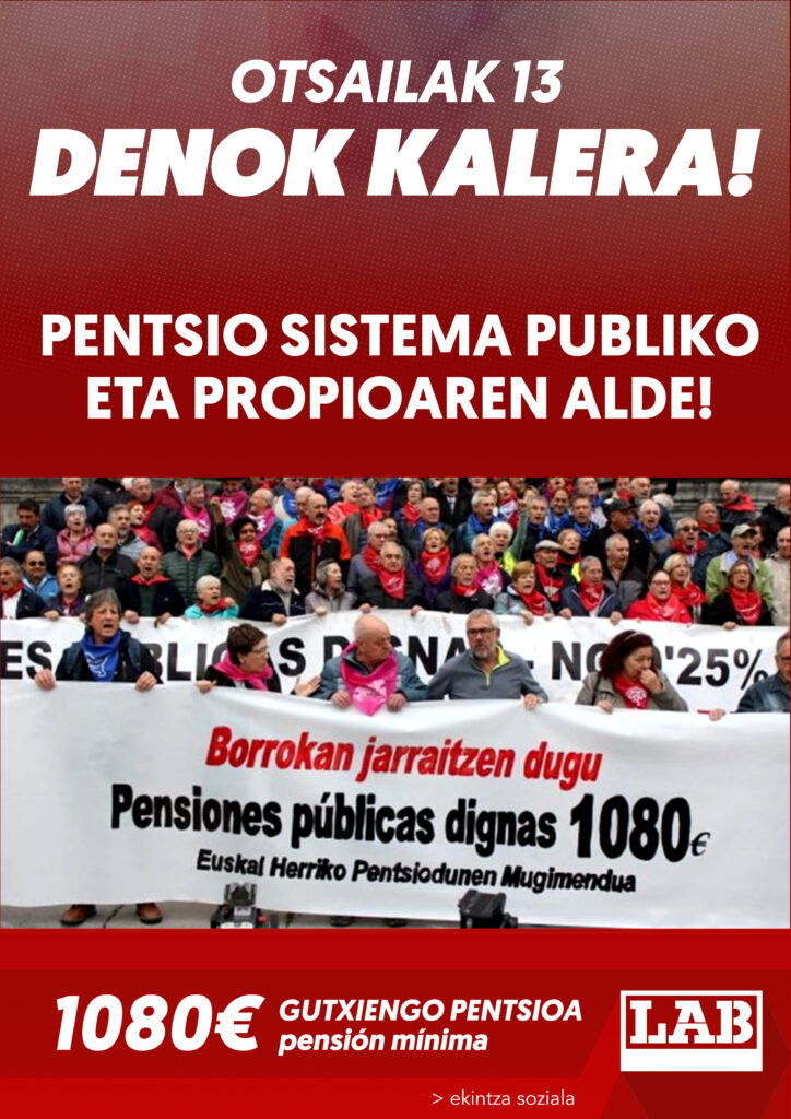El movimiento de pensionistas de Euskal Herria ha convocado movilizaciones para este sábado en las cuatro capitales de Hego Euskal Herria. El sindicato LAB quiere sumarse a la convocatoria y subrayar la importancia de que los y las trabajadoras participen en las movilizaciones. Lo que está en juego son las pensiones futuras de las y los trabajadores y las bases de nuestro sistema de pensiones: o se garantizan unas condiciones de vida dignas o se profundizará en la precariedad, en la brecha de género o en las diferencias sociales haciendo un sistema insolidario.