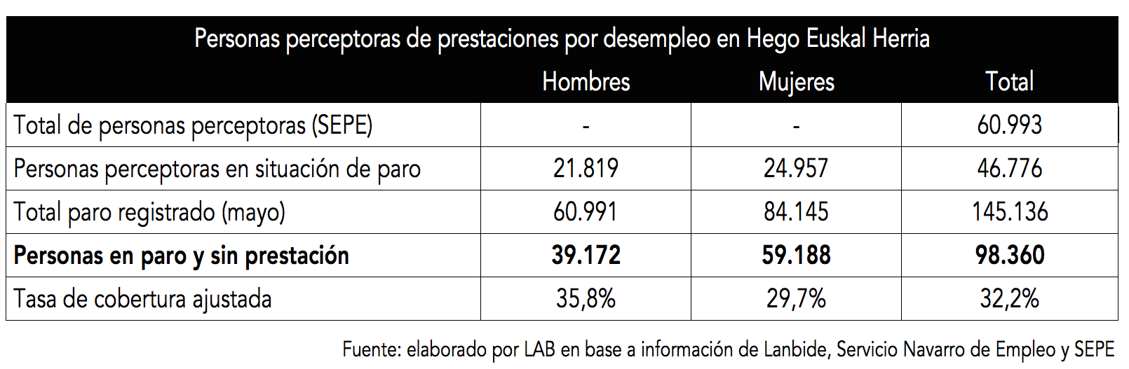 Actualmente hay un total de 98.360 personas desempleadas que no reciben ningún tipo de prestación por desempleo en Hego Euskal Herria. El 60% son mujeres. Se trata de un colectivo expulsado del mercado laboral, abandonado por el sistema español de protección frente al desempleo, y empujado a la pobreza y a la exclusión social. De manera que las rentas de garantía de nivel autonómico (de cuantía inferior al umbral de pobreza) constituyen su última de red de seguridad.