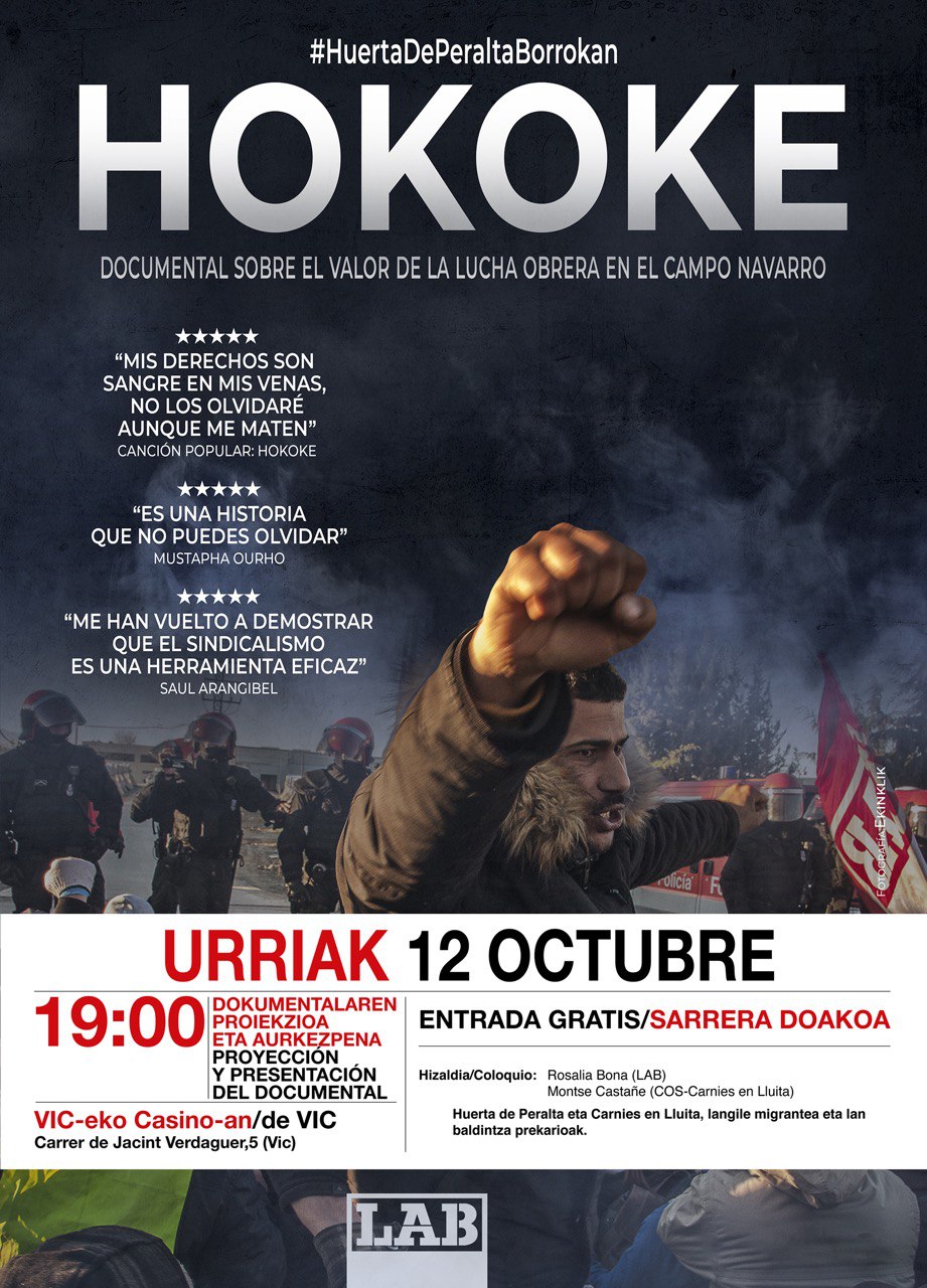 Este fin de semana, una delegación del sindicato LAB estará en Catalunya presentando el documental Hokoke sobre la lucha sindical en Huerta de Peralta. Concretamente, hemos preparado una presentación el viernes y otra el sábado para dar a conocer esta lucha de las y los trabajadores de Huerta de Peralta.
