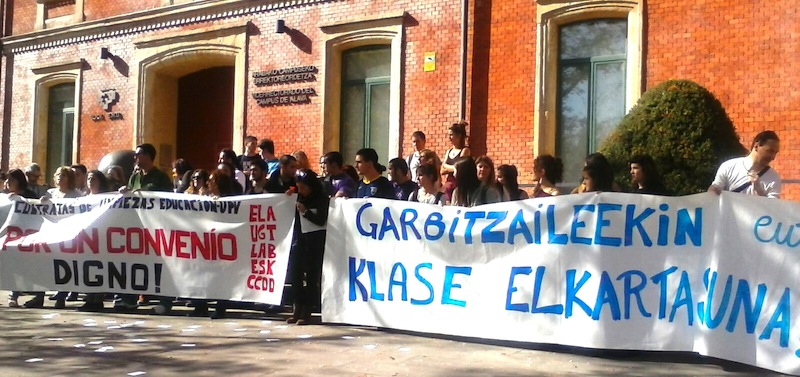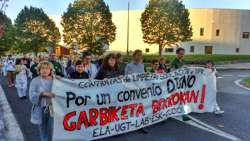 Trabajadoras y trabajadores de las contratas de limpieza del Departamento de Educación y de la UPV se han movilizado hoy por un convenio digno en Leioa, Donostia y Gasteiz, a convocatoria de LAB, ELA, UGT, ESK y CCOO. "Tras dos años y medio de negociación del Convenio Colectivo de limpieza en centros educativos la situación se encuentra, prácticamente, como al inicio. No hay convenio y no parece tampoco que vaya a haberlo en los próximos meses. La patronal no sólo tiene bloqueada la situación, si no que mantiene una actitud provocadora, denotando una absoluta falta de respeto hacia sus propias trabajadoras", han señalado.