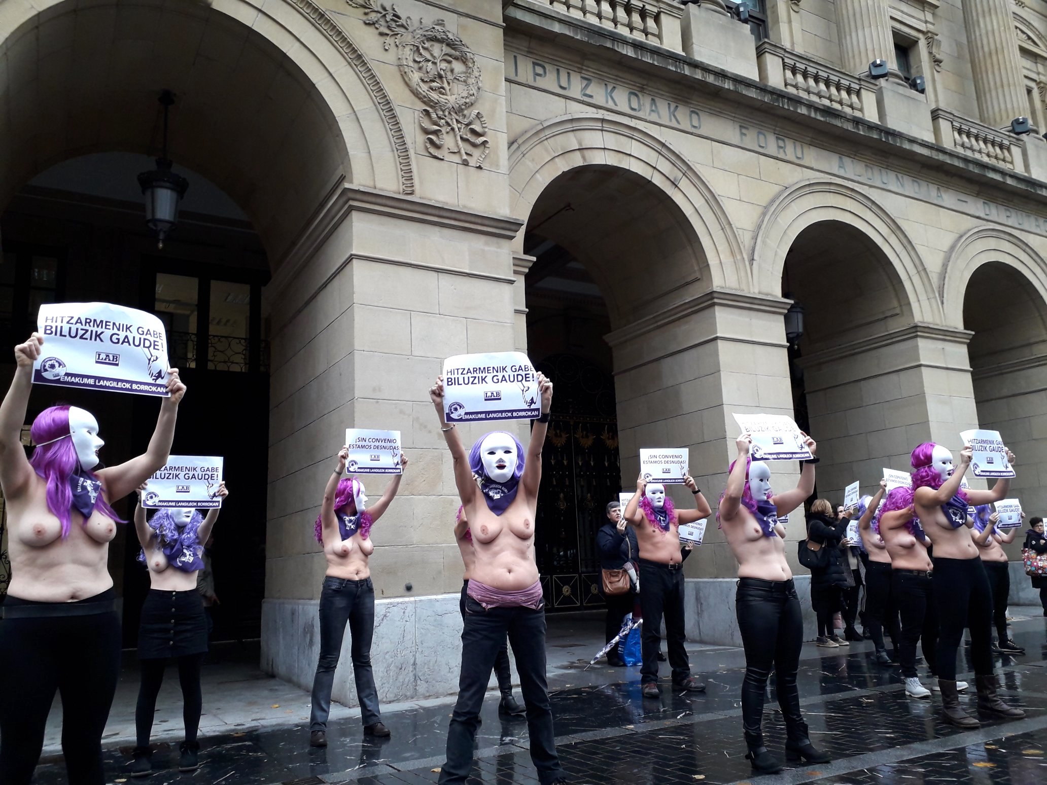 Gipuzkoako helduen egoitzetako langileek ekintza indartsua egin dute Foru Aldundiaren Jauregiaren aurrean, LAB sindikatuak deituta. Hain zuzen ere, gerritik gora biluztu dira Aldundiaren eta patronalen jarrera salatzeko. Hitzarmenik gabe jarraitzen dute langileek, erabat biluzik, babesik gabe, Gipuzkoako helduen egoitzetan kalitatezko zerbitzu bat eskaintzeko aukerarik gabe, euren lan baldintza kaskarren ondorioz.