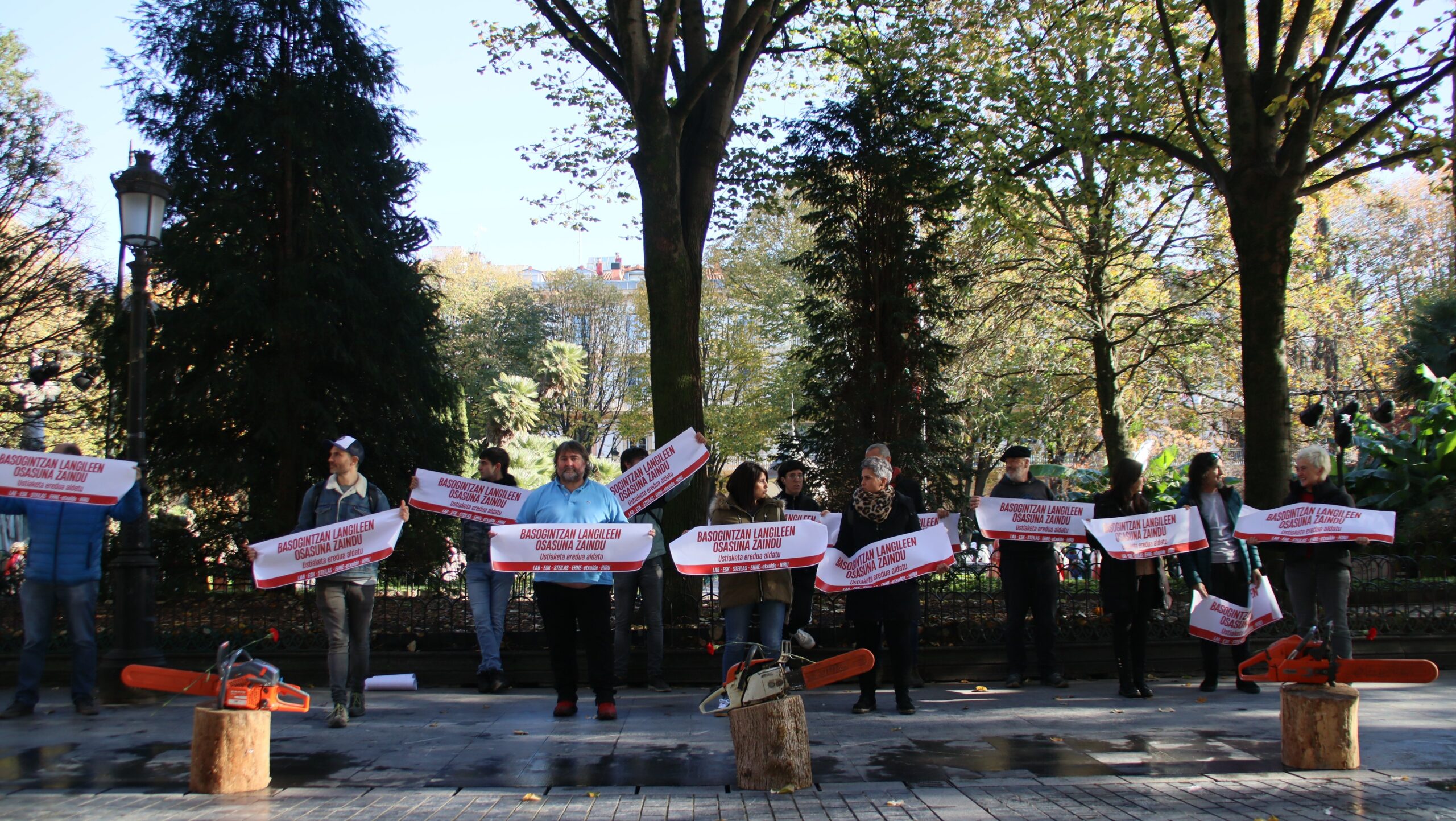 LAB, ESK, STEILAS, EHNE-etxalde e HIRU nos hemos movilizado hoy frente a la sede de la Diputación Foral de Gipuzkoa en Donostia con 3 troncos y otras tantas motosierras y claveles para denunciar las 3 muertes ocurridas en el sector forestal en lo que va de año. Asimismo, han registrado un escrito en las Diputaciones de Bizkaia y Gipuzkoa y en las Juntas Generales de ambos territorios, reclamando cuidar la salud de las y los trabajadores forestales y un cambio de modelo de explotación intensivo.