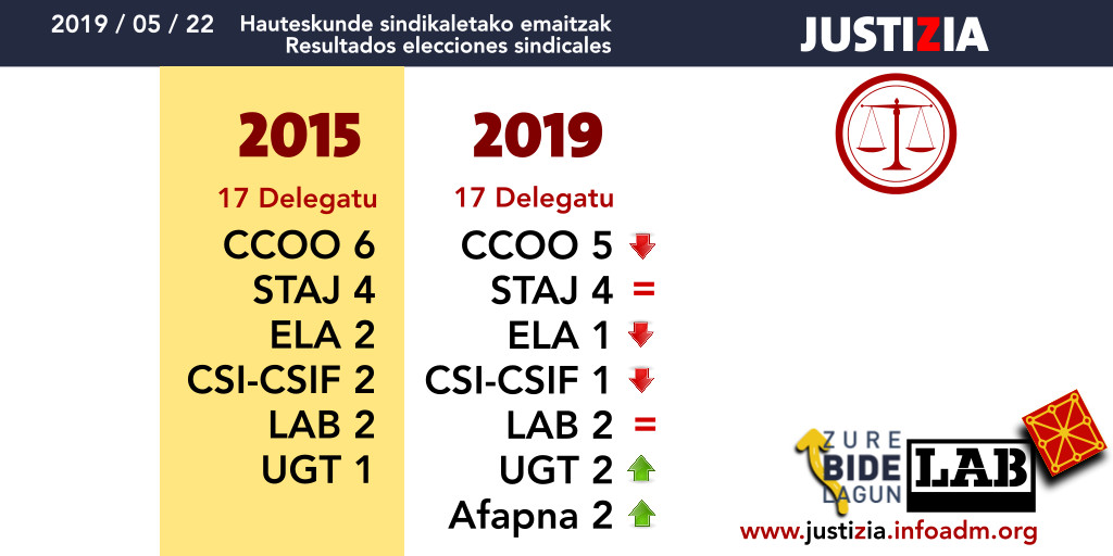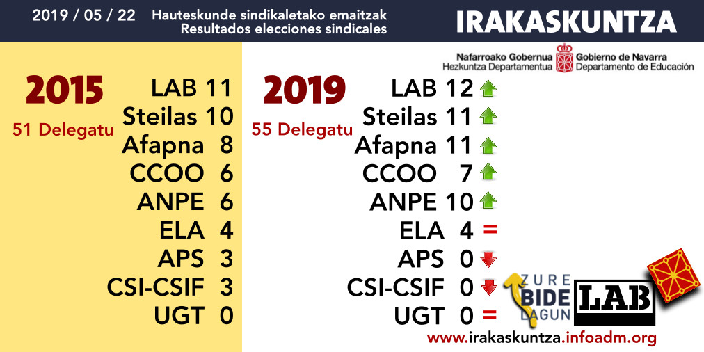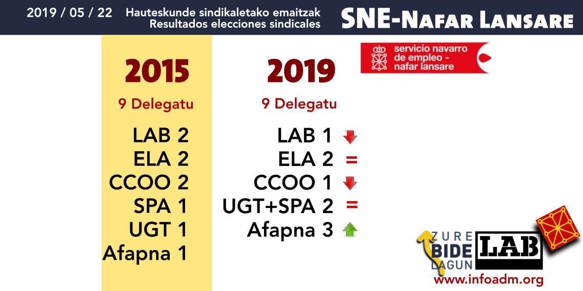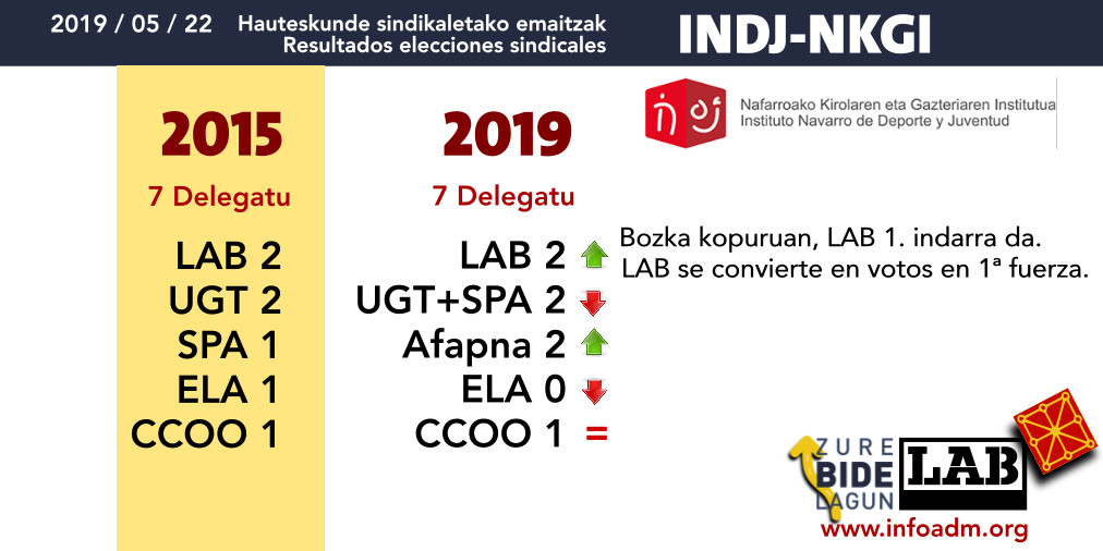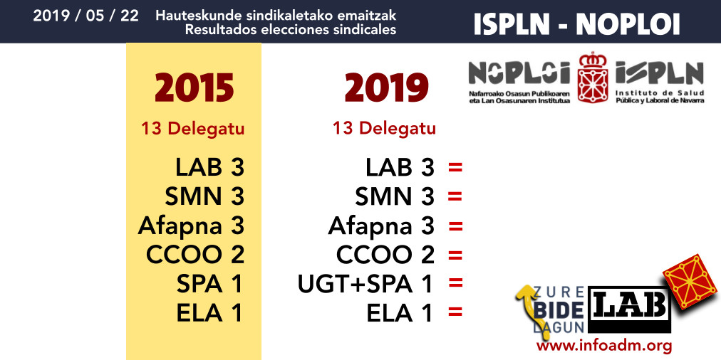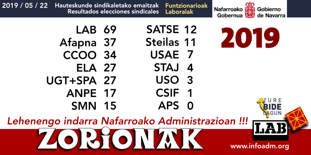 Así pues, eskerrik asko nuevamente por el apoyo que le habéis vuelto a mostrar a LAB y al cambio en Navarra. Por nuestra parte, únicamente nos queda confirmar que continuaremos defendiendo los derechos de toda la plantilla de las administraciones navarras y que haremos todo lo que esté en nuestras manos por asentar y ahondar en el cambio que tanto necesita Navarra y que ya se inició en 2015.