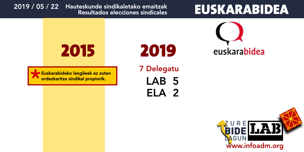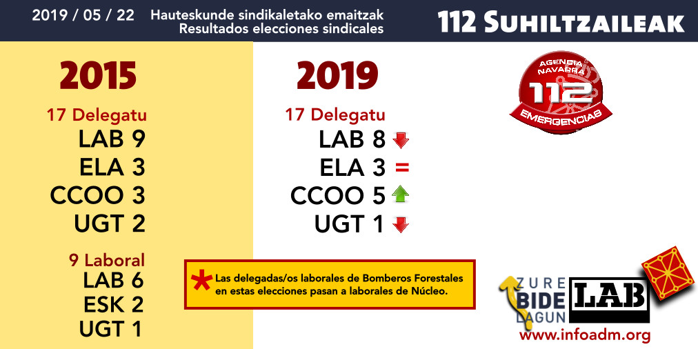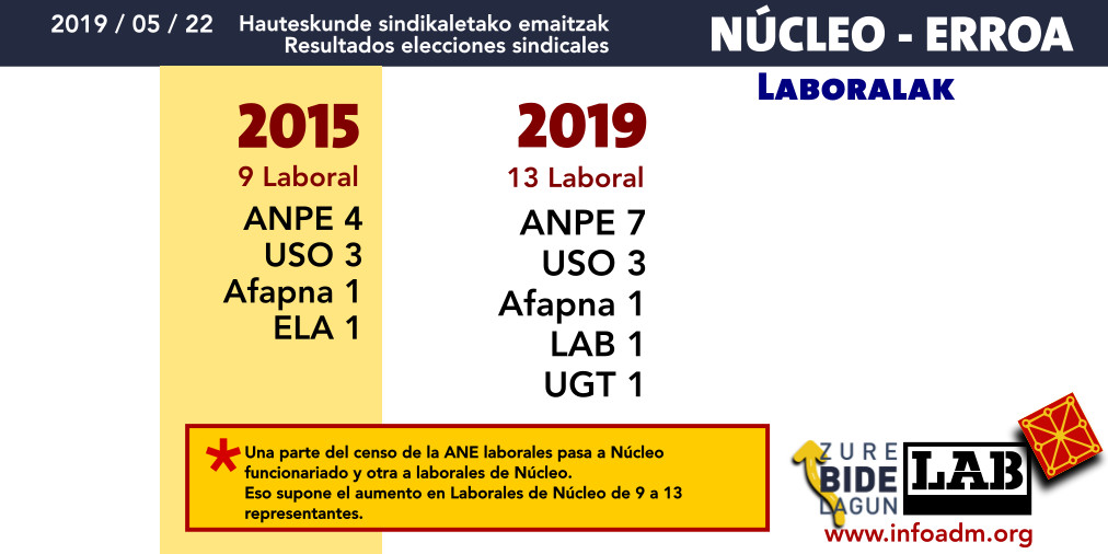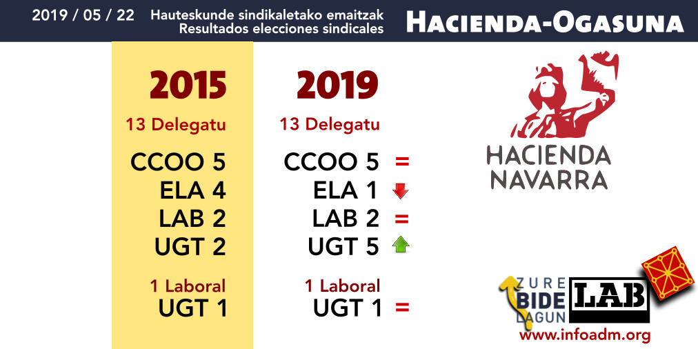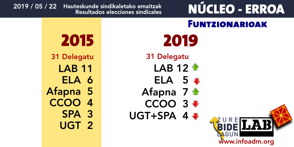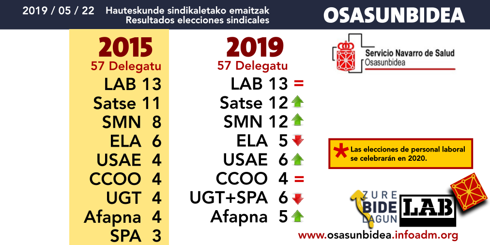 LAB ha vuelto a erigirse, ayer en la primera fuerza sindical de la Administración pública de Nafarroa. Continuaremos defendiendo los derechos de toda la plantilla de las administraciones navarras y haremos todo lo que esté en nuestras manos por asentar y ahondar en el cambio que tanto necesita Nafarroa y que ya se inició en 2015.