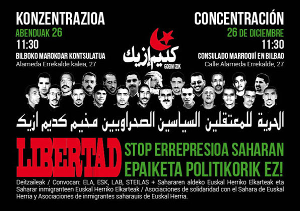 Duela 6 urte, 2010eko Azaroaren 8an, Marokoko indar okupatzaileek Gdeim Izik kanpamendua suntsitu zuten modu bortitzean. Horren harira Marokoko erreinuak 25 pertsona atxilotu zituen modu arbitrarioan eta handik 2 urtera zigor gogorretara kondenatu zituen. Mobilizazioari esker epaiketa militar hura bertan behera geratzea lortu zen, baina kartzelan jarraitzen dute. Guzti hau salatu eta abenduaren 26ko epaiketa berria bertan gera dadin eskatuz mobilizazioa egingo dugu 11:30tan Marokok bilbon duen kontsulatuaren aurrean.