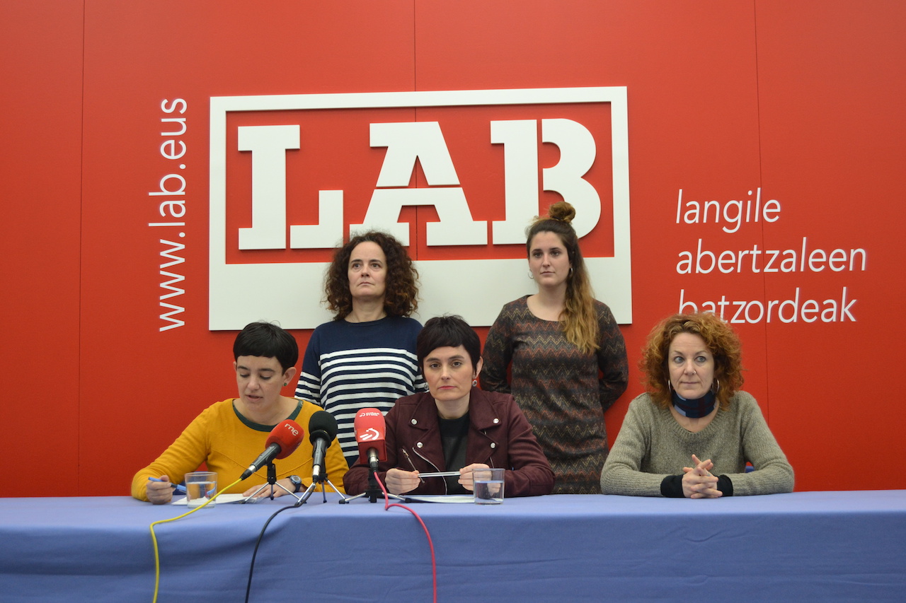 Garbiñe Aranburu, secretaria general de LAB, y Arantxa Vazquez, integrante del comité ejecutivo del sindicato, han comparecido para realizar una valoración de lo que ha aportado la huelga feminista del 8 de marzo a las luchas de las mujeres trabajadoras. Concretamente, han destacado que LAB se encuentra reforzado para seguir haciendo frente a las situaciones de discriminación que vivimos las mujeres y continuar desarrollando la acción sindial feminista en los centros de trabajo. En este sentido, han dado a conocer propuestas y reivindicaciones para cambiar la situación: "Tenemos propuestas para terminar con toda situación de discriminación que sufrimos las mujeres, y lo más importante, estamos fuertes, tal y como hemos demostrado este 8 de marzo".