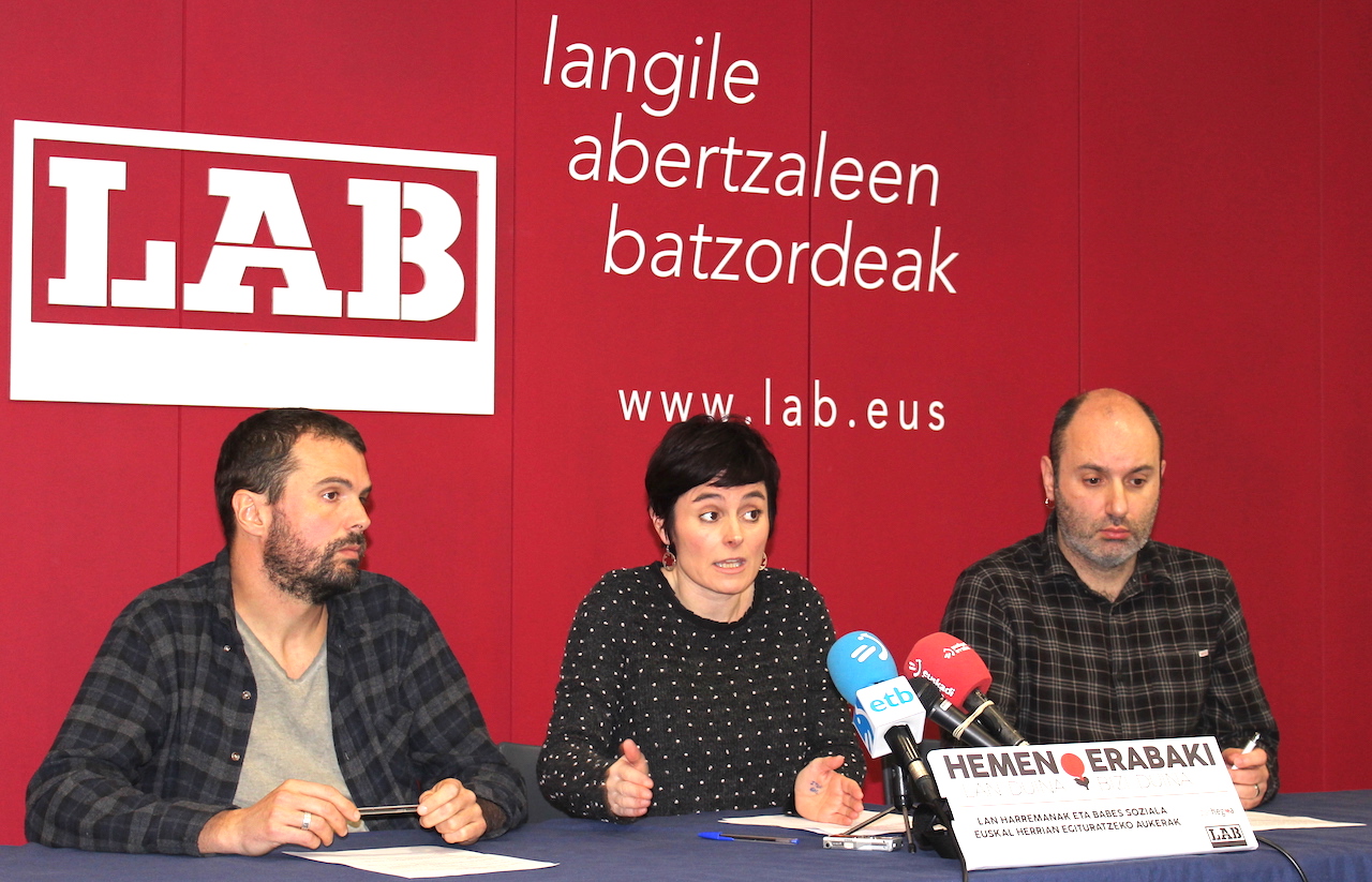 LABeko idazkari nagusi Garbiñe Aranburuk, idazkari ondoko Igor Arroyok eta Prestakuntza idazkari Jagoba Zuluetak hartu dute hitza agerraldian.