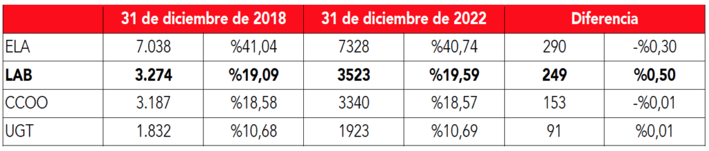 Como se puede observar, en este periodo de cuatro años sin grandes altibajos LAB es el único sindicato que crece (0,50% más), mientras que el resto de sindicatos se mantienen estables (UGT, CCOO) o con tendencia a la baja (ELA). De esta forma, LAB se refuerza como segundo sindicato de la CAV y aumenta la diferencia con el tercero, CCOO, en casi 200 representantes más.