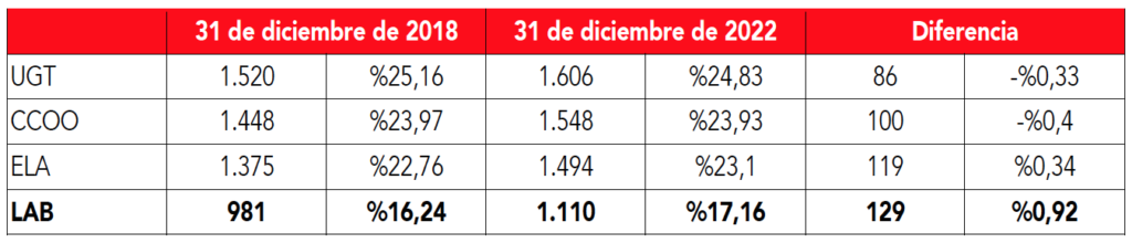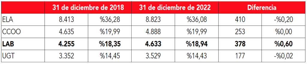 Tal y como se puede observar, LAB es el único sindicato que crece, mientras el resto se mantiene (UGT, CCOO) o desciende ligeramente (ELA).