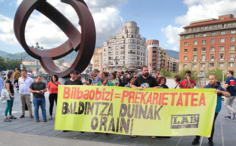 Mobilizazioa egin dugu Bilboko Udalaren aurrean, Bilbobuseko zerbitzua ustiatzen duen enpresak epai irmo bat bete dezan eskatzeko