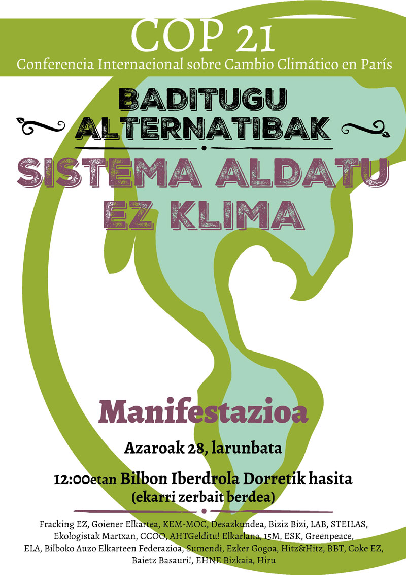 Bajo el lema "Baditugu alterbatibak: Sistema aldatu, ez klima!" el próximo sábado, 28 de noviembre, denunciaremos el las calles de Bilbo que el capitalismo pone en peligro nuestras vidas y la naturaleza y para reivindicar que existen alternativas ante ese modelo. La convocatoria se enmarca en la convocatoria mundial realizada antes de que comience la Cumbre COP21 de Paris