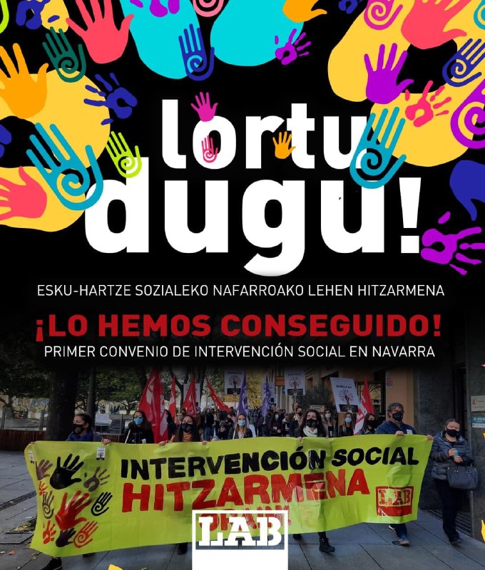 LAB quiere destacar, antes que nada, la lucha, ganas, empoderamiento y determinación de trabajadores y trabajadoras de Intervención Social, que mediante infinidad de iniciativas y movilizaciones -que incluyeron los primeros paros y la primera huelga del sector- no han cejado hasta conseguir el objetivo histórico de lograr el primer convenio del sector en Navarra. Nos han demostrado que organizarse, movilizarse, luchar, e ir a la huelga merece la pena. Que sólo sacando las reivindicaciones a la calle éstas tienen su sitio en la agenda política e institucional. Además, su lucha es una clara muestra de solidaridad de clase, ya que tiene un carácter general y no simplemente sectorial, porque más allá de la defensa de su condiciones de trabajo, plantea la defensa de unos servicios sociales dignos para todas las personas.