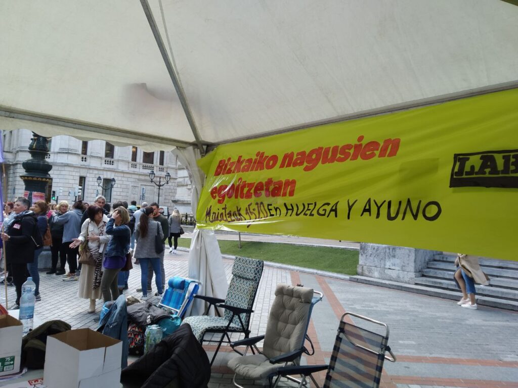 La iniciativa, que se prolongará hasta el sábado, pretende reivindicar que las trabajadoras del sector de los cuidados son empleadas públicas y merecen unas condiciones dignas. Por todo ello, con el ayuno que han emprendido frente al Palacio Foral de Bizkaia exigirán, entre otras medidas, ratios que les permitan trabajar como es debido y prestar un servicio de calidad.