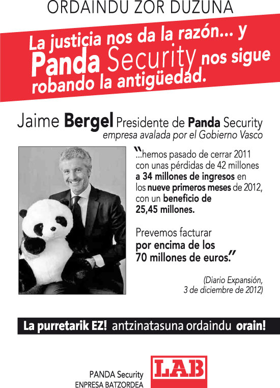 Tras más de 2 años de conflicto en Panda Security y gracias a la lucha llevada por la plantilla con el Comité a la cabeza y respaldados por el sindicato LAB, los trabajadores y trabajadoras cobraran íntegramente la antigüedad que por convenio les corresponde.