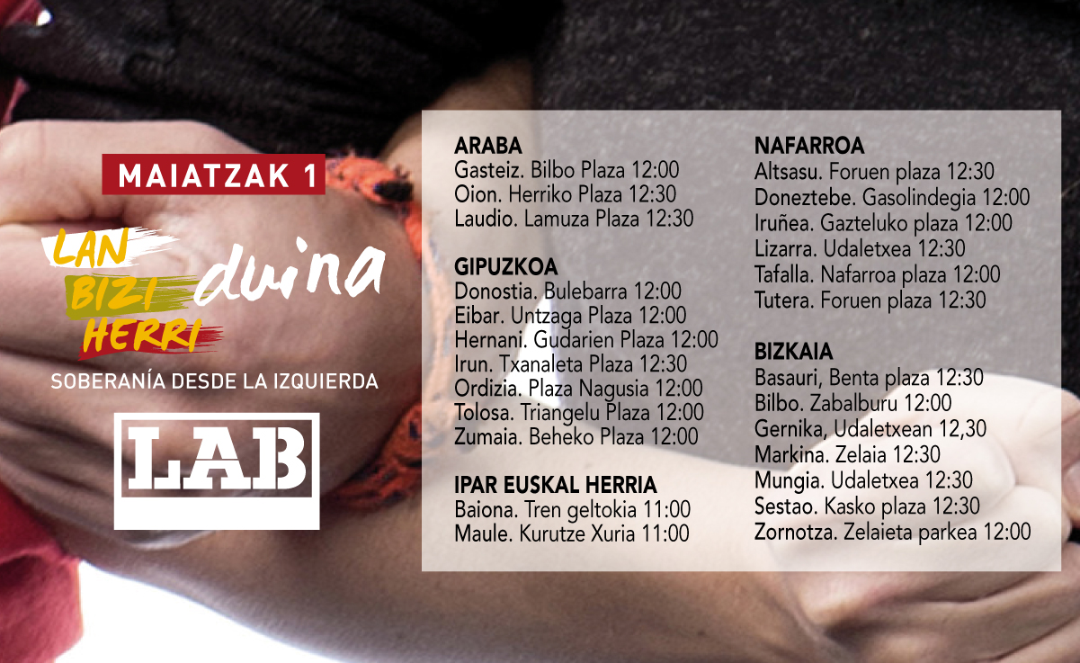 LABek aurtengo Maiatzaren Leheneko bere irakurketa eta egun horretarako deituko dituen mobilizazioen berri eman du gaur Bilbon, LABeko idazkari nagusi Garbiñe Aranburu, Antolakuntza Idazkari Izaskun Garcia eta Komunikazio idazkari Maider Jauregiren eskutik. Eskualdez eskualde hainbat mobilizazio egingo ditugula jakinarazi dute, "Lan, bizi, herri duina" leloarekin.