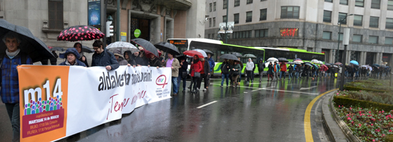 Martxoaren 14an Euskal Herriko Eskubide Sozialen Kartak manifestazioak deitu ditu Bilbo eta Iruñean, “Aldaketa soziala orain, ¡tenemos alternativas!” lemapean. Gaur, eskubide sozialetan aldaketarako alternatiba badela aldarrikatzeko eta M14ra deituz giza katea egin du Bilbon. 11:30ean hasi da mobilizazioa, Eusko Jaurlaritzaren parean.