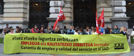 Bizkaiko etxez etxeko laguntza zerbitzuko langileek elkarretaratzea egin zuten atzo Bilboko Bizkaiko Foru Aldundiaren aurrean etxez etxeko laguntza zerbitzuan enplegua eta kalitatezko zerbitzua bermatu dadin eskatzeko.