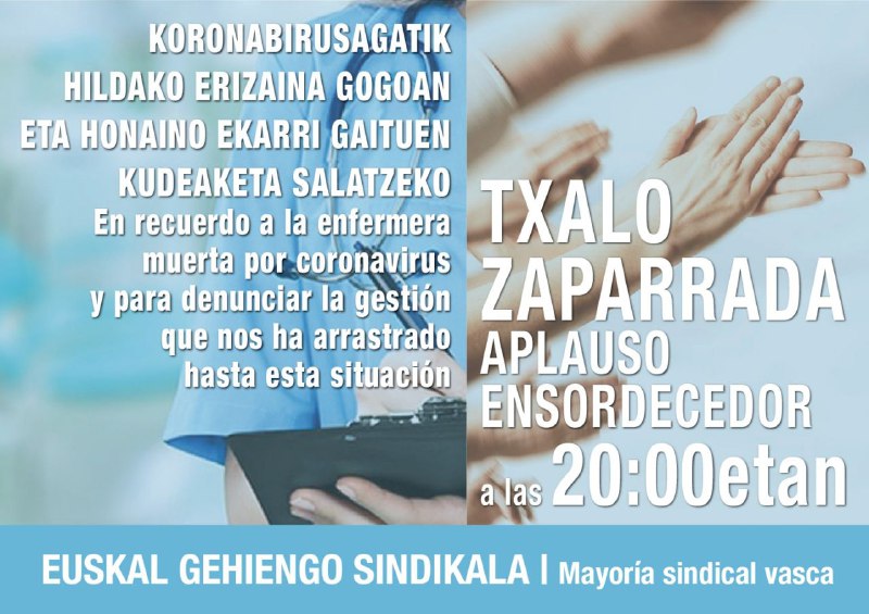 Orain inoiz baino gehiago osasuna interes ekonomikoen gainetik jartzeko momentua da. Ez dugu onartuko krisi honen kudeaketa langileen bizkar gainera erortzea. Gehiengo sindikikalak dei egiten dugu langileoi, herritarroi, gaur, hilak 19, 20:00etako txalo zaparradetan balkoitik parte hartzera, lan postuan hil den erizainaren heriotza salatzeko.