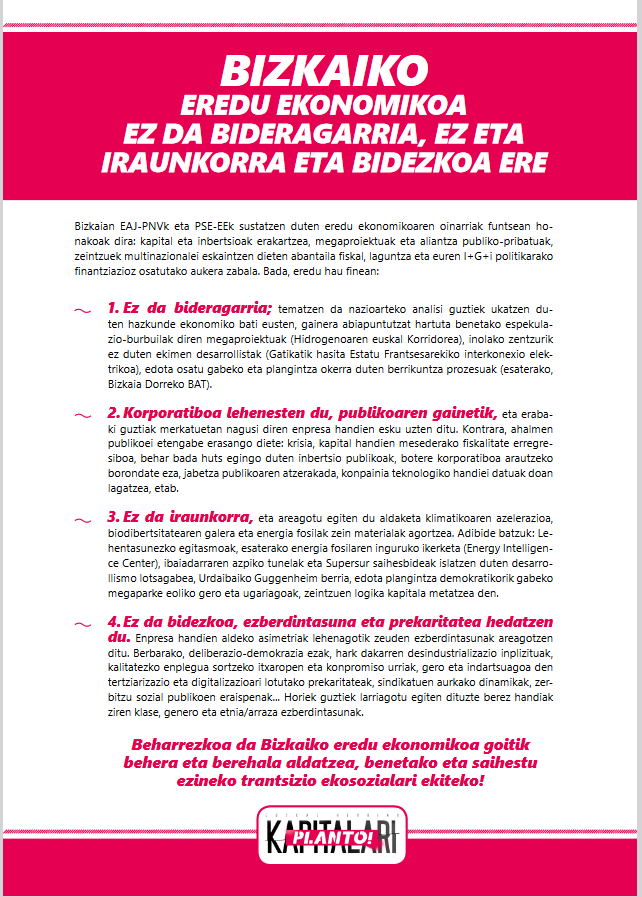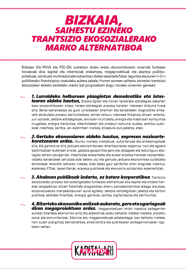 EAJ eta PSEk Bizkaian sustatu duten ereduak megaproiektuei, botere korporatiboari eta kapital handiei ateak pare pare irekitzen dizkie, langileon eta gure lurraldearen gainetik pasatuz. Horren aurrean, trantsizio ekosozial justua helburu izango duen norabide aldaketa beharrezkoa da, gertuko ekonomia jasangarria sustatuz eta ekonomian ahalmen publikoa handituz. Gainera, plangintza demokratiko eta loteslearen aldeko hautua egin beharra dago, langileok trantsizio horren protagonista izan gaitezen.