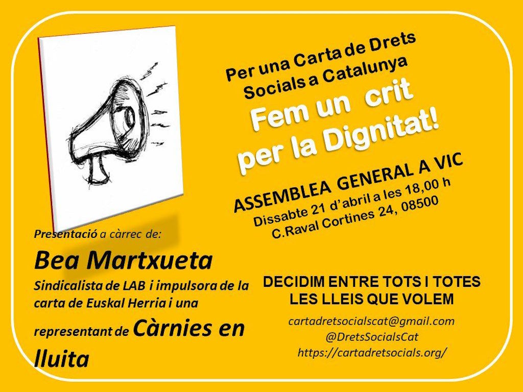 Katalunian Karta Sozialaren eraketa prozesua bultzatzen ari dira, Euskal Herriko Eskubide Sozialen Karta gisako tresna bat sortzeko bidean. Hala, Vic herrian batzar bat egingo dute larunbatean, 18:00etan, eta LABeko ordezkaritza bat izango da han, eraketa prozesu horretan laguntza emateko. Hain zuzen ere, LABeko Ekintza Sozialeko Bea Martxuetak hartuko du hitza, eta Euskal Herriko Eskubide Sozialen Kartaren nondik norakoak azalduko ditu.